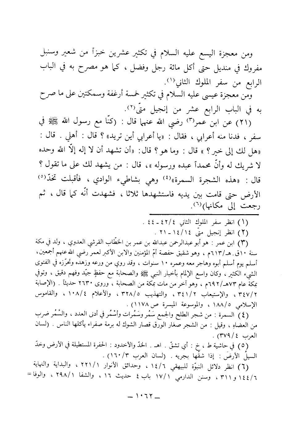 21- عن ابن عمر رضي الله عنهما قال: كنا مع رسول الله صلى الله عليه وسلم في سفر فدنا منه أعرابي، فقال: يا أعرابي أين تريد؟ قال: أهلي، قال: هل لك إلى خير؟ قال: وما هو؟ قال: أن تشهد أن لا إله إلا الله وحده لا شريك له وأن محمداً عبده ورسوله، قال: من يشهد لك على ما تقول، قال: هذه الشجرة السمرة، وهي بشاطئ الوادي، فأقبلت تخد الأرض حتى قامت بين يديه فاستشهدها ثلاثاً. فشهدت أنه كما قال ثم رجعت إلى مكانها.
