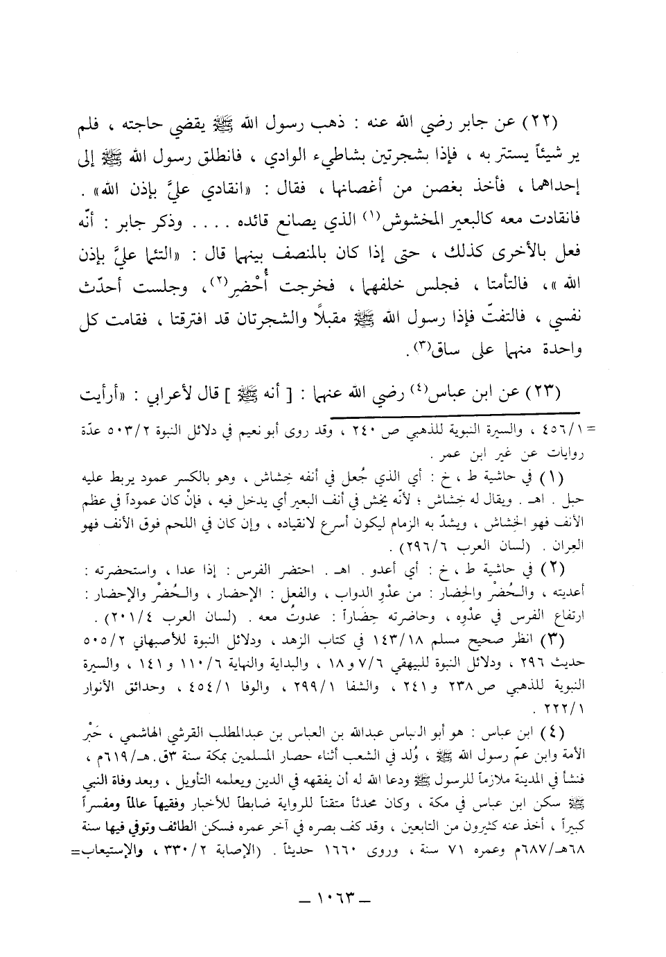 22- عن جابر رضي الله عنه ذهب رسول الله صلى الله عليه وسلم يقضي حاجته فلم ير شيئاً يستتر به، فإذا بشجرتين بشاطئ الوادي، فانطلق رسول الله صلى الله عليه وسلم إلى إحداهما، فأخذ بغصن من أغصانها فقال: انقادي علي بإذن الله، فانقادت معه كالبعير المخشوش الذي يصانع قائده. وذكر جابر أنه فعل بالأخرى كذلك حتى إذا كان بالمنصف بينهما قال: التئما علي بإذن الله فالتأمتا، فجلس خلفهما فخرجت أخضر. وجلست أحدث نفسي فالتفت فإذا رسول الله صلى الله عليه وسلم مقبلاً والشجرتان قد افترقتا فقامت كل واحدة منهما على ساق.