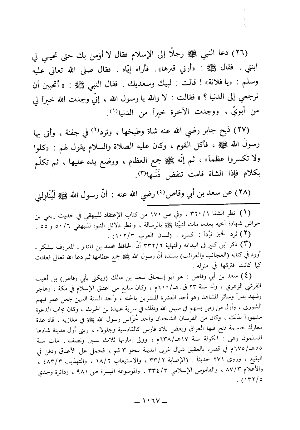 26- دعا النبي صلى الله عليه وسلم رجلاً إلى الإسلام، فقال: لا أؤمن بك حتى تحيي لي ابنتي. فقال صلى الله عليه وسلم: أرني قبرها فأراه إياه، فقال صلى الله عليه وسلم: يا فلانة. قالت: لبيك وسعديك. فقال النبي صلى الله عليه وسلم: أتحبين أن ترجعي إلى الدنيا؟ فقالت: لا والله يا رسول الله إني وجدت الله خيراً لي من أبوي، ووجدت الآخرة خيراً من الدنيا.
