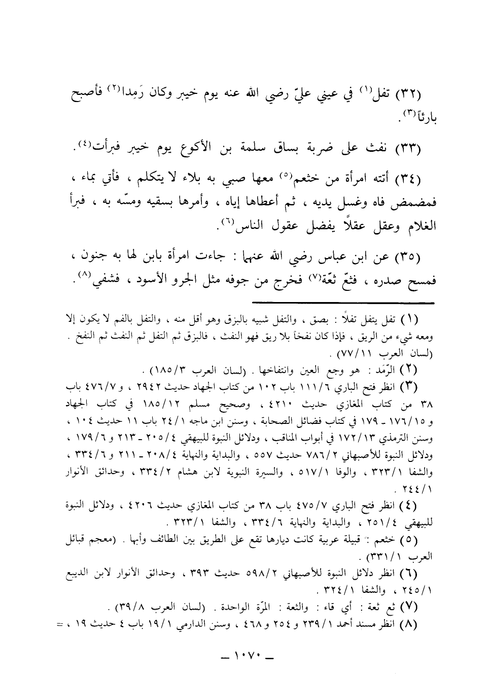 33- نفث على ضربة بساق سلمة بن الأكوع يوم خيبر فبرأت.
