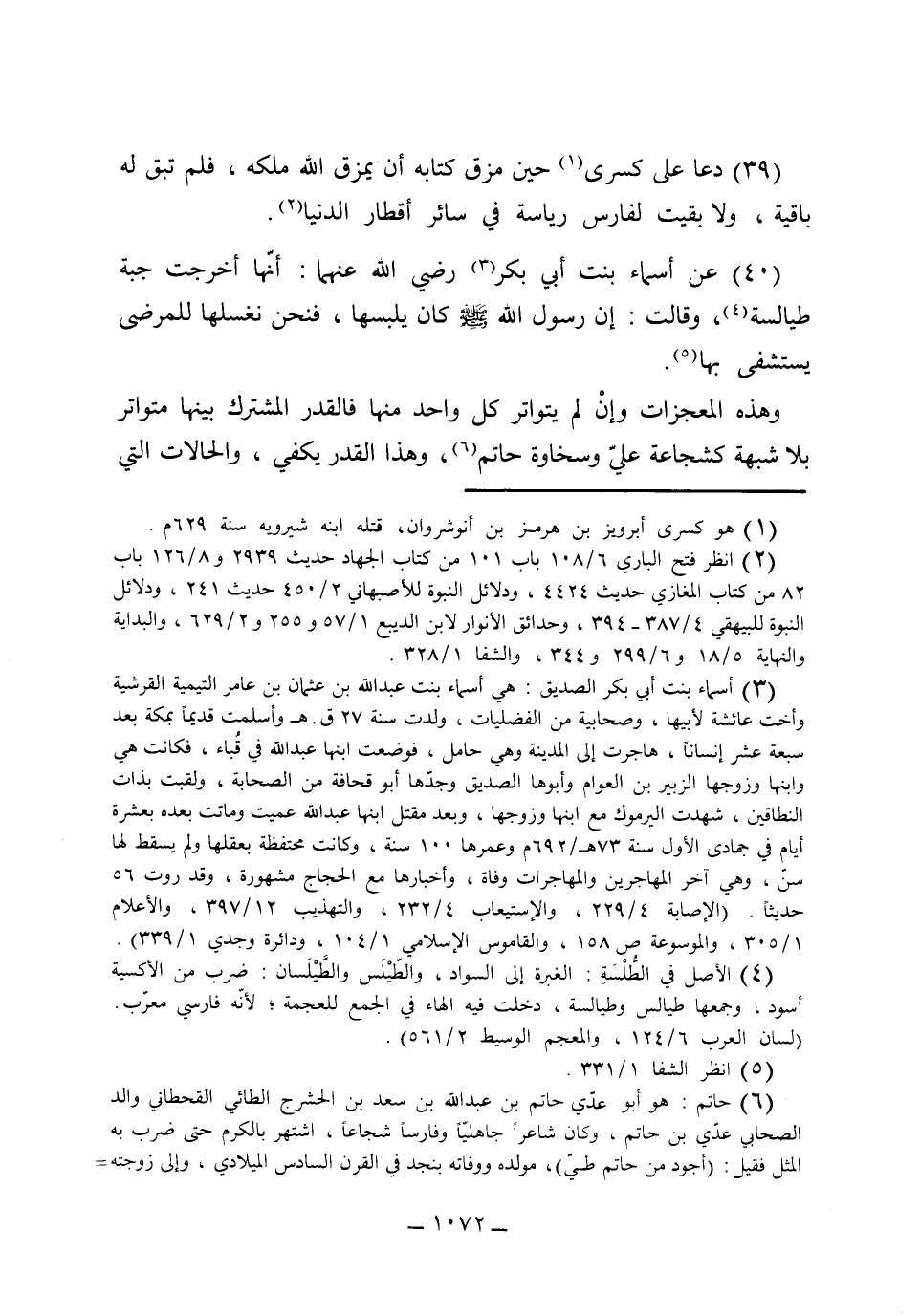 40- عن أسماء بنت أبي بكر رضي الله عنهما أخرجت جبة طيانسة وقالت: إن رسول الله صلى الله عليه وسلم كان يلبسها، فنحن تغسلها للمرضى يستشفى بها. وهذه المعجزات، وإن لم يتواتر كل واحد منها، فالقدر المشترك بينها متواتر بلا شبهة، كشجاعة علي، وسخاوة حاتم، وهذا القدر يكفي، والحالات التي