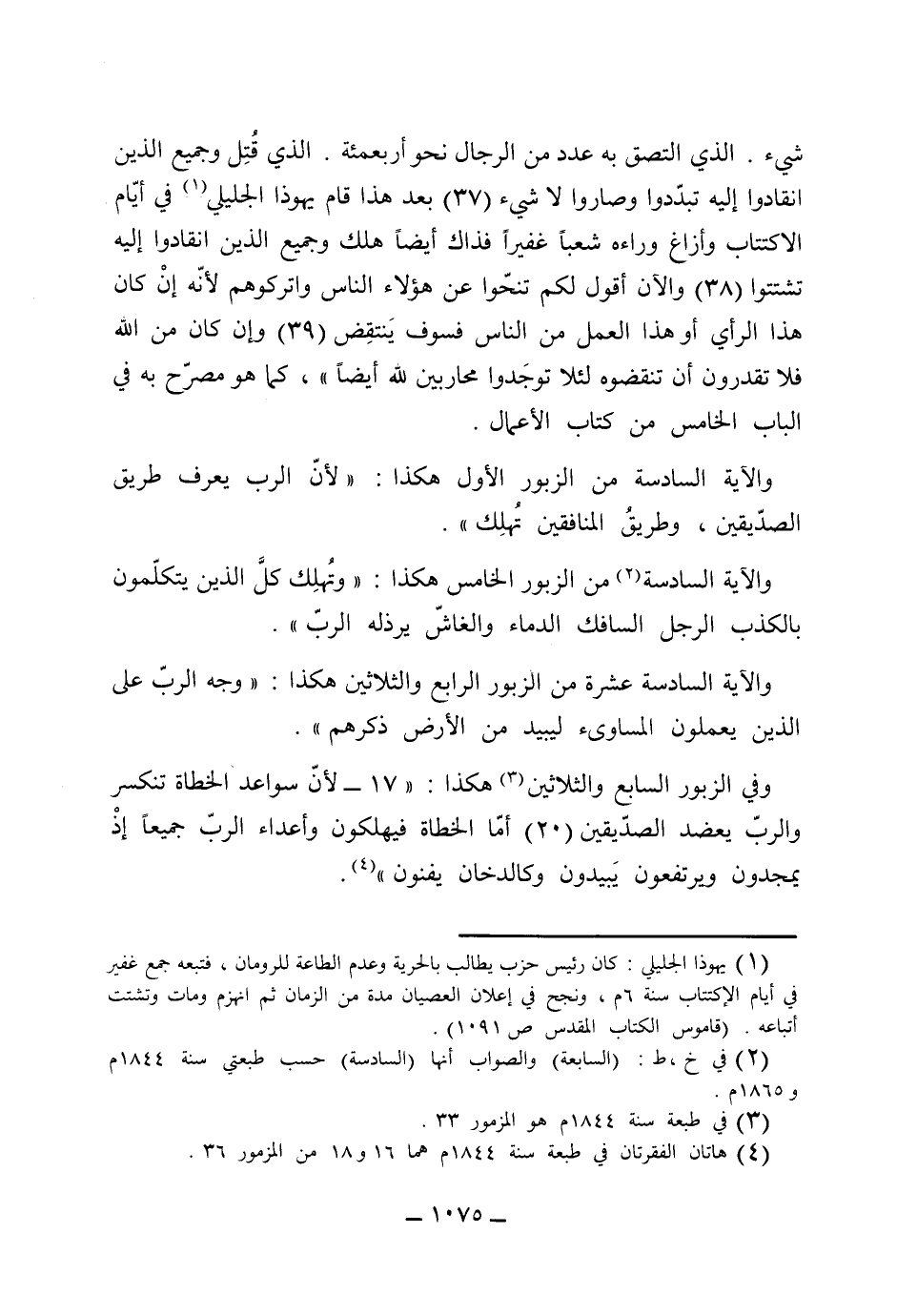 شيء الذي التصق به عدد من الرجال نحو أربعمائة، الذي قتل وجميع الذين انقادوا إليه تبددوا وصاروا لا شيء) . 37 (بعد هذا قام يهودا الجليلي في أيام الاكتتاب، وأزاغ وراءه شعباً غفيراً، فذاك أيضاً هلك وجميع الذين انقادوا إليه تشتتوا) . 38 (والآن أقول لكم تنحوا عن هؤلاء الناس واتركوهم لأنه إن كان هذا الرأي وهذا العمل من الناس فسوف ينتقض) 39 (وإن كان من الله فلا تقدرون أن تنتقضوه لئلا توجدوا محاربين لله أيضاً) كما هو مصرح به في الباب الخامس من كتاب الأعمال، والآية السابعة من الزبور الأول هكذا: (لأن الرب يعرف طريق الصديقين وطريق المنافقين تهلك) والآية السادسة من الزبور الخامس هكذا: (وتهلك كل الذين يتكلمون بالكذب، الرجل السافك الدماء والغاش يرذله الرب) .