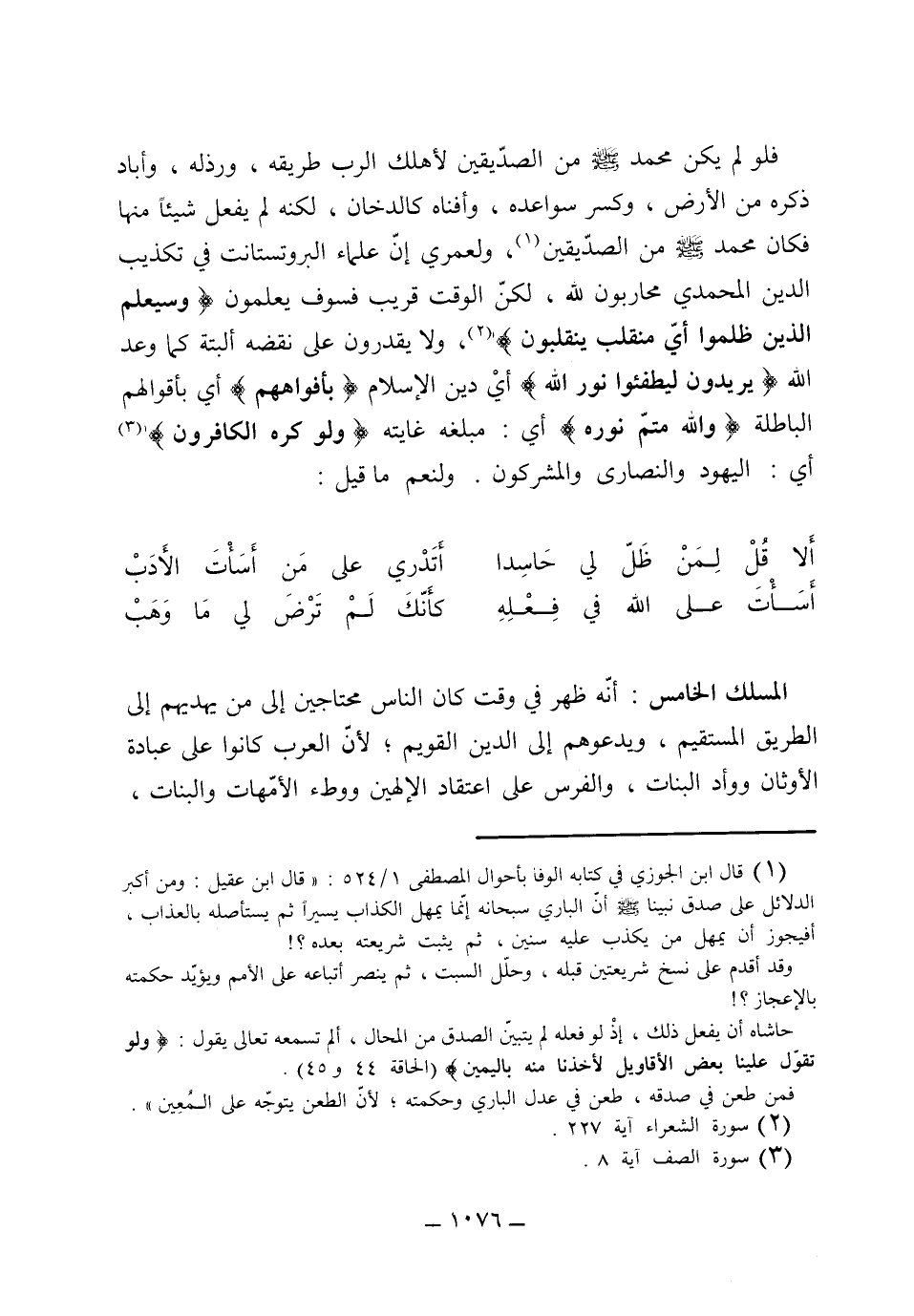فلو لم يكن محمد صلى الله عليه وسلم من الصديقين لأهلك الرب طريقه ورذله وأباد ذكره من الأرض، وكسر سواعده وأفناه كالدخان. لكنه لم يفعل شيئاً منها، فكان محمد صلى الله عليه وسلم من الصديقين، ولعمري أن علماء بروتستنت في تكذيب الدين المحمدي محاربون الله لكن الوقت قريب فسوف يعلمون {وسيعلم الذين ظلموا أي منقلب ينقلبون} ولا يقدرون على نقضه البتة كما وعد الله {يريدون ليطفئوا نور الله} أي دين الإسلام {بأفواههم} أي بأقوالهم الباطلة {والله متم نوره} أي مبلغه غايته {ولو كره الكافرون} أي اليهود والنصارى والمشركون، ولنعم ما قيل: