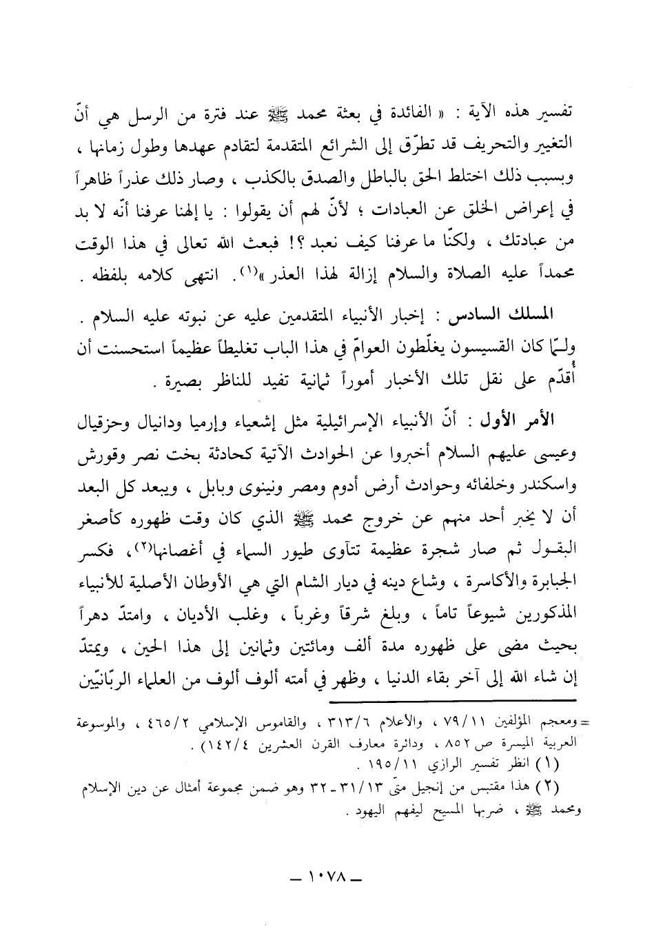 (المسلك السادس) أخبار الأنبياء المتقدمين عليه، عن نبوته عليه السلام، ولما كان القسيسون يغلطون العوام في هذا الباب تغليطاً عظيماً استحسنت أن أقدم على نقل تلك الأخبار أموراً ثمانية تفيد للناظر بصيرة: