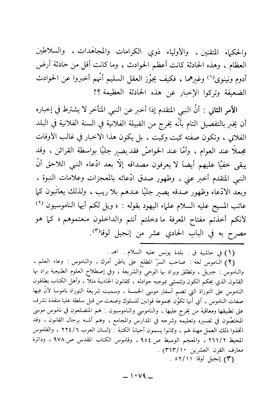 (الأمر الثاني) أن النبي المتقدم إذا أخبر عن النبي المتأخر، لا يشترط في إخباره أن يخبر بالتفصيل التام بأنه يخرج من القبيلة الفلانية في السنة الفلانية في البلد الفلاني، وتكون صفته كيت وكيت، بل يكون هذا الإخبار في غالب الأوقات مجملاً عند العوام، وأما عند الخواص فقد يصير جلياً بواسطة القرائن، وقد يبقى خفياً عليهم أيضاً لا يعرفون مصداقه إلا بعد ادعاء النبي اللاحق أن النبي المتقدم أخبر عني وظهور صدق ادعائه بالمعجزات وعلامات النبوة، وبعد الادعاء وظهور صدقه يصير جلياً عندهم بلا ريب ولذلك يعاتبون كما عاتب المسيح عليه السلام علماء اليهود بقوله: (ويل لكم أيها الناموسيون لأنكم أخذتم مفتاح المعرفة ما دخلتم أنتم والداخلون منعتموهم) كما هو مصرح به في الباب الحادي عشر من إنجيل لوقا،