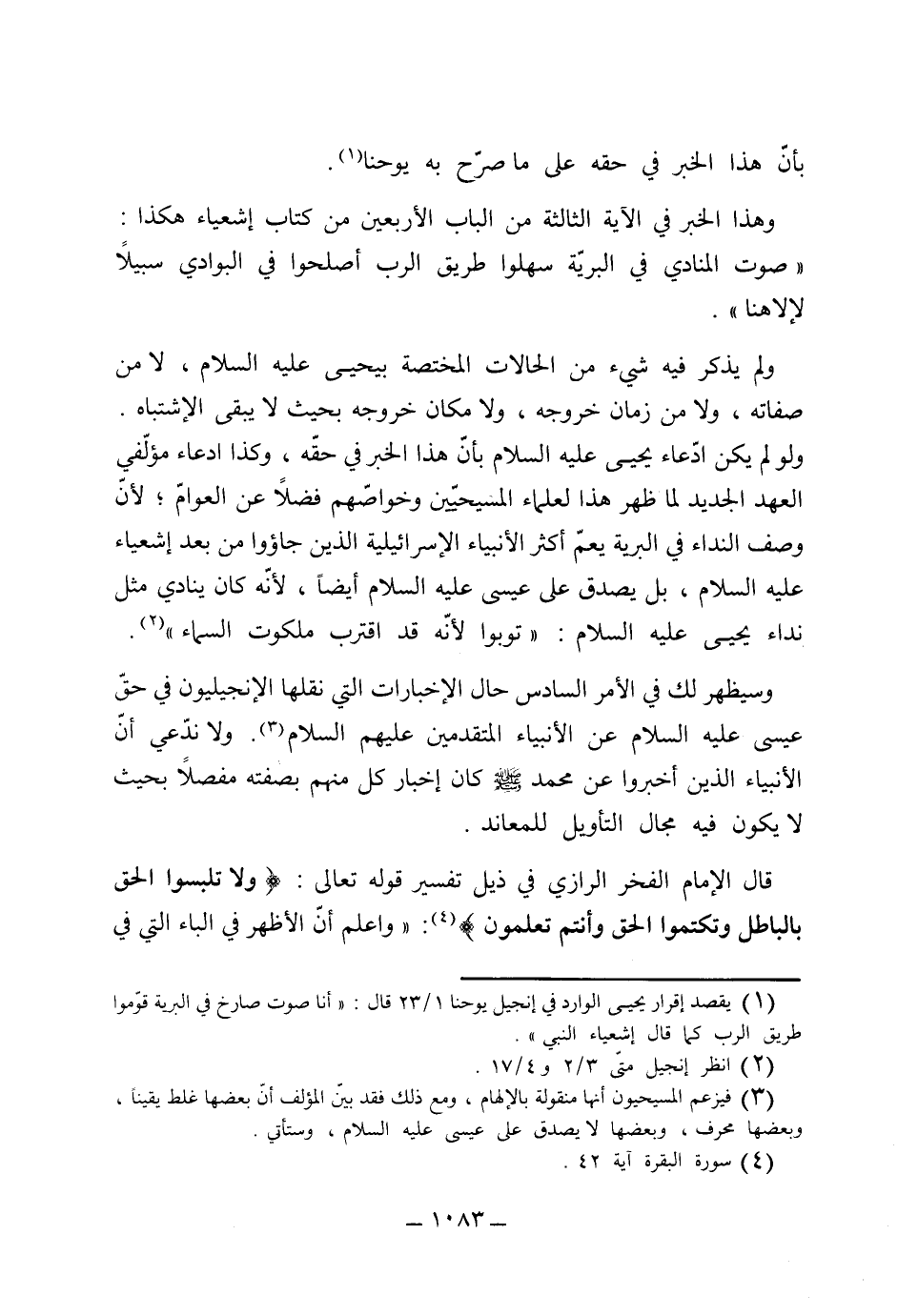 بأن هذا الخبر في حقه على ما صرح به يوحنا. وهذا الخبر في الآية الثالثة من الباب الأربعين من كتاب أشعيا هكذا: (صوت المنادي في البرية، سهلوا طريق الرب، أصلحوا في البوادي سبيلاً لإلهنا) ولم يذكر فيه شيء من الحالات المختصة بيحيى عليه السلام لا من صفاته ولا من زمان خروجه، ولا مكان خروجه، بحيث لا يبقى الاشتباه، ولو لم يكن ادعاء يحيى عليه السلام بأن هذا الخبر في حقه، وكذا ادعاء مؤلفي العهد الجديد، لما ظهر هذا للعلماء المسيحية وخواصهم فضلاً عن العوام، لأن وصف النداء في البرية يعم أكثر الأنبياء الإسرائيلية الذين جاؤوا من بعد أشعيا عليه السلام، بل يصدق على عيسى عليه السلام أيضاً. لأنه كان ينادي مثل نداء يحيى عليه السلام: توبوا لأنه قد اقترب ملكوت السماء.