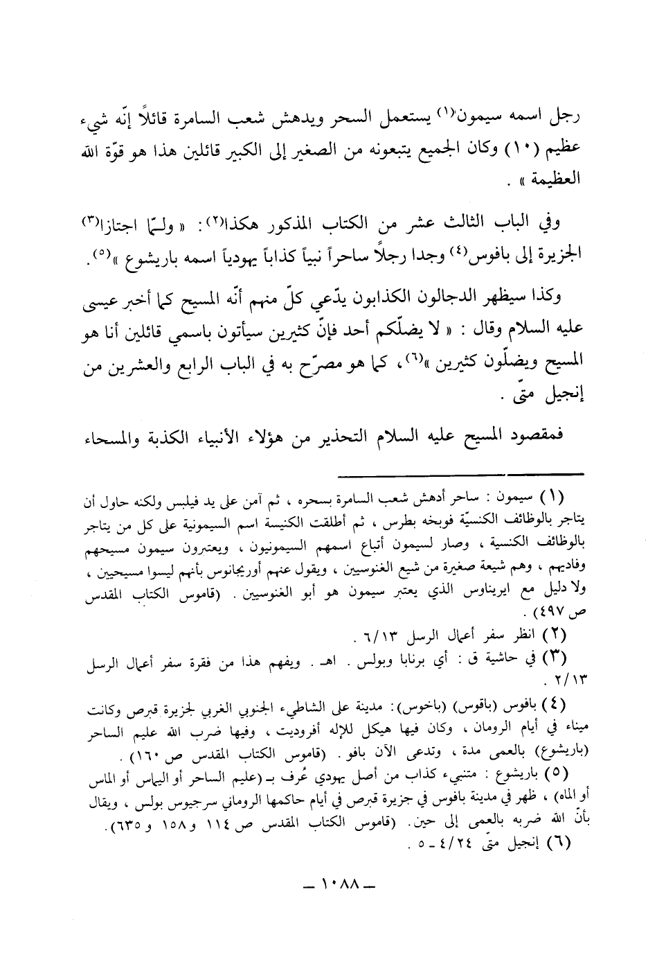 وفي الباب الثالث عشر من الكتاب المذكور هكذا: (ولما اجتازا الجزيرة إلى باقوس وجدا رجلاً ساحراً نبياً كذاباً يهودياً اسمه باريشوع) وكذا سيظهر الدجالون الكذابون يدعي كل منهم أنه المسيح كما أخبر عيسى عليه السلام وقال: (لا يضلكم أحد فإن كثيرين سيأتون باسمي قائلين أنا هو [ص 223] المسيح ويضلون كثيرين) كما هو مصرح به في الباب الرابع والعشرين من إنجيل متى فمقصود المسيح عليه السلام التحذير من هؤلاء الأنبياء الكذبة والمسحاء