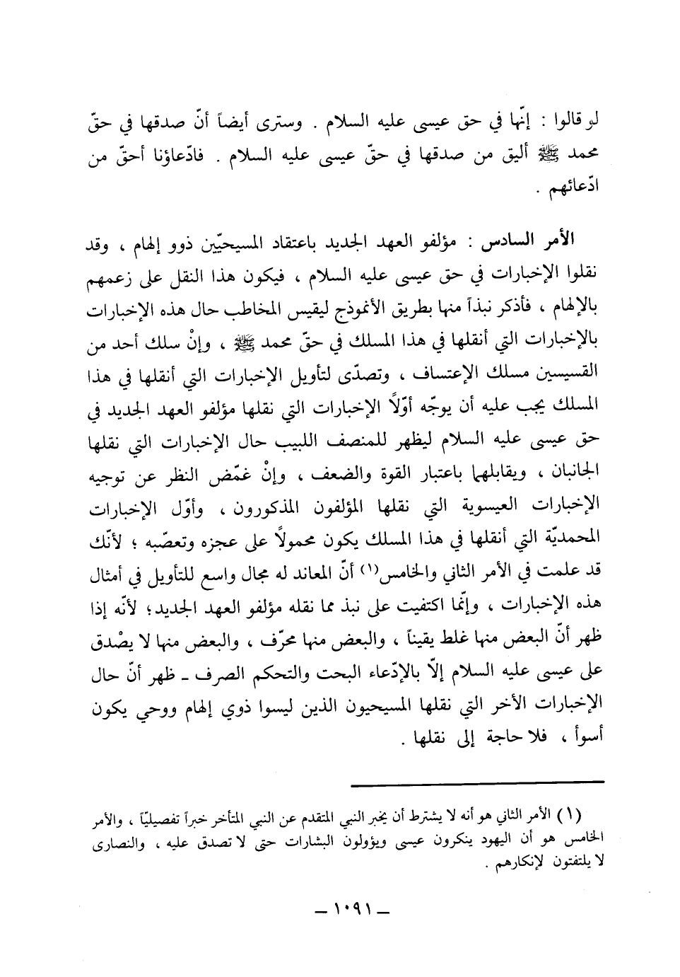 (الأمر السادس) مؤلفوا العهد الجديد باعتقاد المسيحيين ذوو إلهام وقد نقلوا الإخبارات في حق عيسى عليه السلام فيكون هذا النقل على زعمهم بالإلهام، فأذكر نبذاً منها بطريق الأنموذج ليقيس المخاطب حال هذه الإخبارات بالإخبارات التي أنقلها في هذا المسلك في حق محمد صلى الله عليه وسلم، وإن سلك أحد من القسيسين مسلك الاعتساف وتصدى لتأويل الإخبارات التي أنقلها في هذا المسلك يجب عليه أن يوجه أولاً الإخبارات التي نقلها مؤلفوا العهد الجديد في حق عيسى عليه السلام، ليظهر للمنصف اللبيب حال الإخبارات التي نقلها الجانبان، ويقابلهما باعتبار القوة والضعف وإن غمض النظر عن توجيه الإخبارات العيسوية التي نقلها المؤلفون المذكورون.