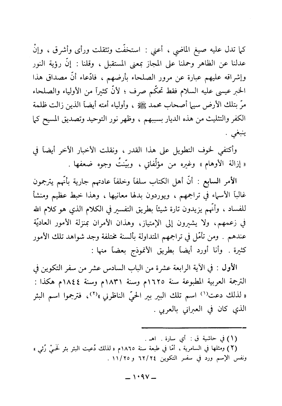(الأمر السابع) أن أهل الكتاب سلفاً وخلفاً عادتهم جارية بأنهم يترجمون غالباً الأسماء في تراجمهم ويوردون بدلها معانيها، وهذا خبط عظيم ومنشأ للفساد وأنهم يزيدون تارة شيئاً بطريق التفسير في الكلام الذي هو كلام الله في زعمهم، ولا يشيرون إلى الامتياز. وهذان الأمران بمنزلة الأمور العادية عندهم، ومن تأمل في تراجمهم المتداولة بألسنة مختلفة وجد شواهد تلك الأمور كثيرة وأنا أورد أيضاً بطريق الأنموذج بعضاً منها.