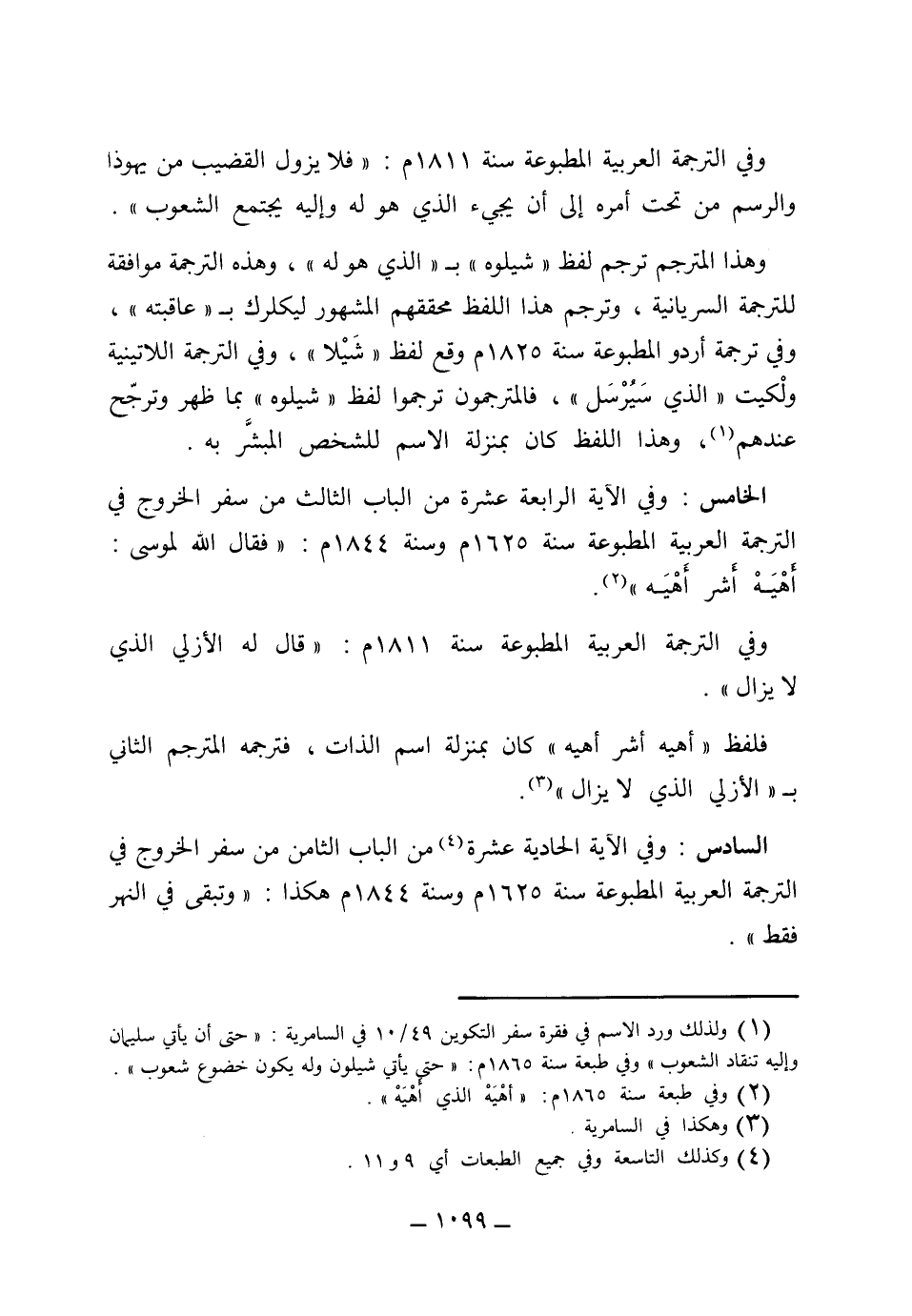 وفي الترجمة العربية المطبوعة سنة 1811: (فلا يزول القضيب من يهودا والرسم من تحت أمره إلى أن يجيء الذي هو له وإليه يجتمع الشعوب) . وهذا المترجم ترجم لفظ شيلوه (بالذي هو له) وهذه الترجمة موافقة للترجمة السريانية وترجم هذا اللفظ محققهم المشهور ليكلرك بعاقبته، وفي ترجمة أردو المطبوعة سنة 1825 وقع لفظ شيلا، وفي الترجمة اللاتينية ولتكيت (الذي سيرسل) . فالمترجمون ترجموا لفظ شيلوه بما ظهر وترجح عندهم وهذا اللفظ كان بمنزلة الاسم للشخص المبشر به.