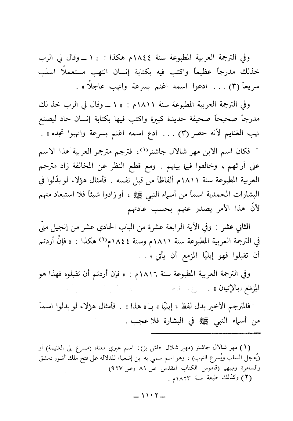 وفي الترجمة العربية المطبوعة سنة 1844 هكذا: 1 (وقال لي الرب خذ لك مدرجاً عظيماً واكتب فيه بكتابة إنسان انتهب مستعجلاً أسلب سريعاً) 3 (ادع اسمه أغنم بسرعة وانهب عاجلاً) . وفي الترجمة العربية المطبوعة سنة 1811 هكذا: (وقال لي الرب: خذ لك مدرجاً صحيحاً صحيفة جديدة كبيرة، واكتب فيها بكتابة إنسان حاد ليضع نهب الغنائم لأنه حضر) 3 (ادع اسمه أغنم بسرعة وانهبوا نجده) . فكان اسم الابن مهر شالال جاشنر، فترجم مترجمو العربية هذا الاسم على آرائهم، وخالفوا فيما بينهم. ومع قطع النظر عن المخالفة، زاد مترجم العربية المطبوعة سنة 1811 ألفاظاً من قبل نفسه، فأمثال هؤلاء لو بدلوا في البشارات المحمدية أسماء من أسماء النبي صلى الله عليه وسلم أو زادوا شيئاً، فلا استبعاد منهم، لأن هذا الأمر يصدر عنهم بحسب عادتهم.
