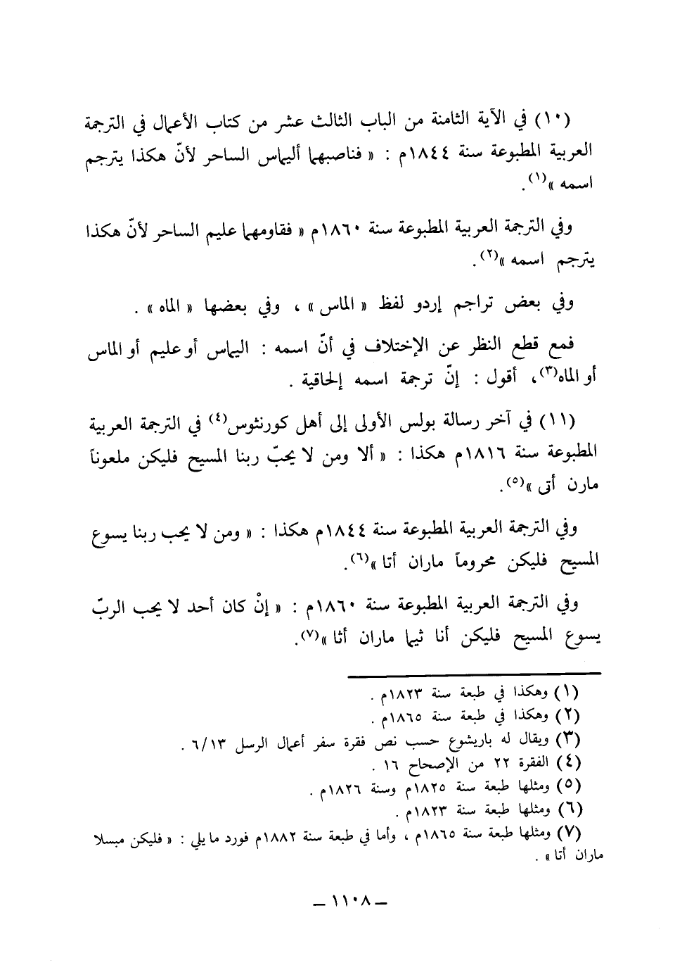 [10] في الآية الثامنة من الباب الثالث عشر من كتاب الأعمال، في الترجمة العربية المطبوعة سنة 1844: (فناصبهما اليماس الساحر لأن هكذا يترجم اسمه) . وفي الترجمة العربية المطبوعة سنة 1860: (فقاومهما عليم الساحر لأن هكذا يترجم) . وفي بعض تراجم أردو لفظ الماس، وفي بعضها الماء، فمع قطع النظر عن الاختلاف في أن اسمه اليماس أو عليم أو الماس أو الماء، أقول أن ترجمة اسمه إلحاقية.