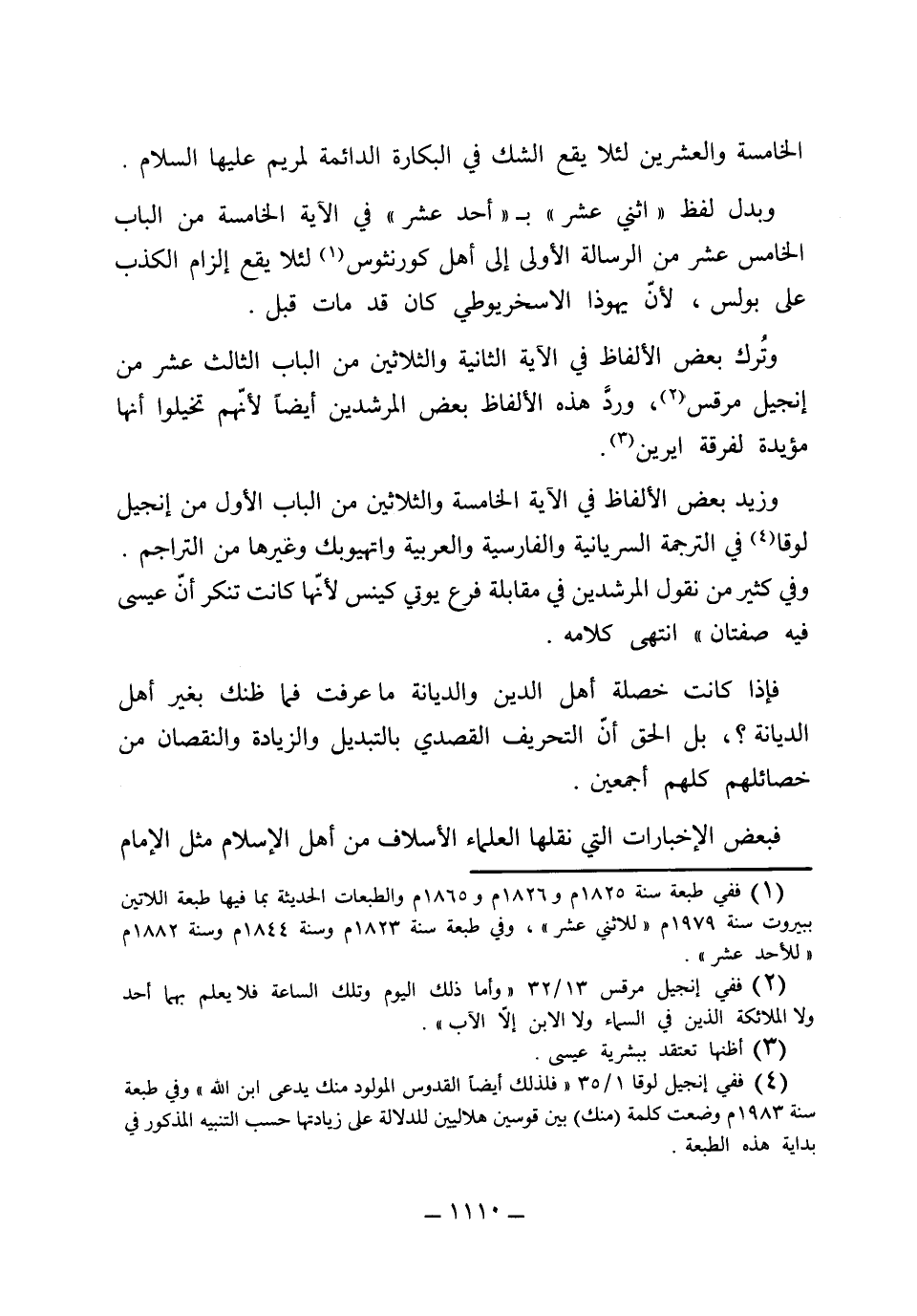 الخامسة والعشرين، لئلا يقع الشك في البكارة الدائمة لمريم عليها السلام، وبدل لفظ اثنتي عشرة بأحد عشر في الآية الخامسة من الباب الخامس عشر من الرسالة الأولى إلى أهل قورنيثوس، لئلا يقع إلزام الكذب على بولس، لأن يهوذا الأسخريوطي كان قد مات قبل وترك بعض الألفاظ في الآية الثانية والثلاثين من الباب الثالث عشر من إنجيل مرقس، ورد هذه الألفاظ بعض المرشدين أيضاً لأنهم تخيلوا أنها مؤيدة لفرقة أيرين وزيد بعض الألفاظ في الآية الخامسة والثلاثين من الباب الأول من إنجيل لوقا في الترجمة السريانية والفارسية والعربية واتهيوبك وغيرها من التراجم، وفي كثير من نقول المرشدين في مقابلة فرقة يؤتى كينس لأنها كانت تنكر