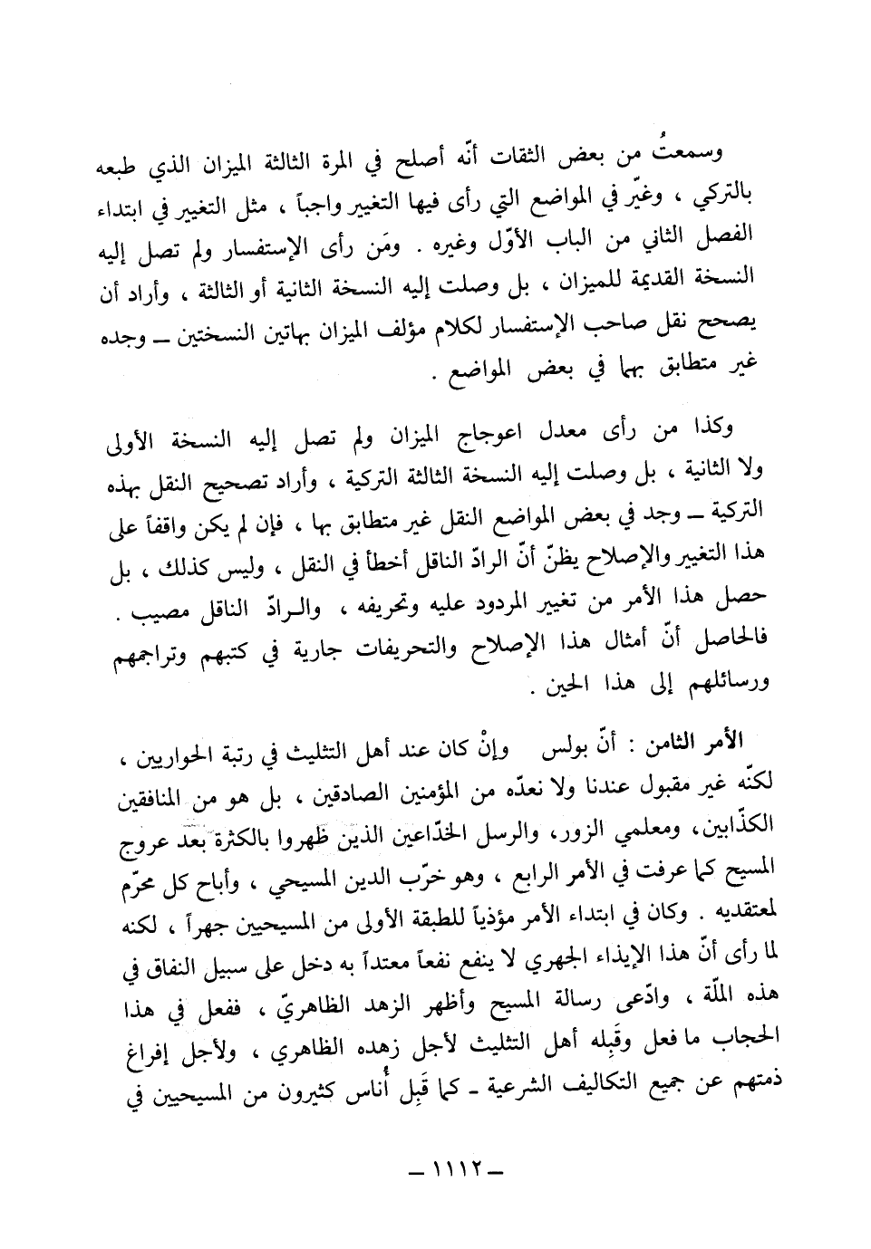 (الأمر الثامن) أن بولس وإن كان عند أهل التثليث في رتبة الحواريين، لكنه غير مقبول عندنا ولا نعده من المؤمنين الصادقين، بل من المنافقين الكذابين ومعلمي الزور والرسل الخداعين، الذين ظهروا بالكثرة بعد عروج المسيح، كما عرفت في الأمر الرابع، وهو خرق الدين المسيحي، وأباح كل محرم لمعتقديه، وكان في ابتداء الأمر مؤذياً للطبقة الأولى من المسيحيين، جهراً، لكنه لما رأى أن هذا الإيذاء الجهري لا ينفع نفعاً معتداً به، دخل على سبيل النفاق في هذه الملة وادعى رسالة المسيح، وأظهر الزهد الظاهري. ففعل في هذا الحجاب ما فعل، وقبله أهل التثليث لأجل زهده الظاهري، ولأجل فراغ ذمتهم عن جميع التكاليف الشرعية. كما قبل أناس كثيرون من المسيحيين في