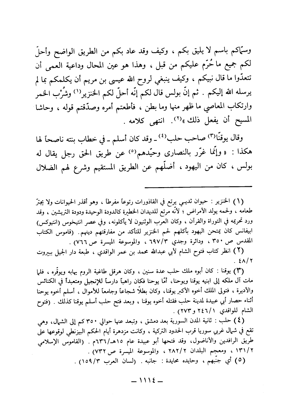 وقال يوقنّا صاحب حلب -وقد كان أسلم- في خطاب بنته ناصحاً لها هكذا: "وإنّما غرّر بالنصارى وحيّدهم عن طريق الحق رجل يقال له بولس، كان من اليهود، أضلّهم عن الطريق المستقيم وشرع لهم الضلال