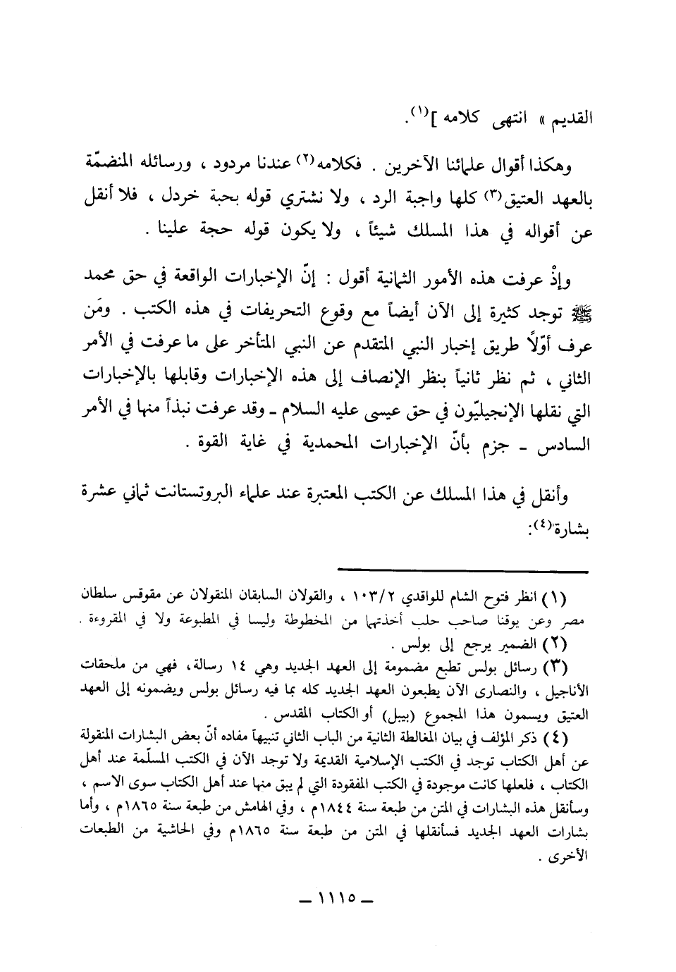 وهكذا أقوال علمائنا الآخرين فكلامه عندنا مردود ورسائله المتضمنة بالعهد العتيق كلها واجبة الرد ولا نشتري قوله بحبة خردل فلا أنقل عن أقواله في هذا المسلك شيئاً ولا يكون قوله حجة علينا، وإذ عرفت هذه الأمور الثمانية أقول أن الإخبارات الواقعة في حق محمد صلى الله عليه وسلم توجد كثيرة إلى الآن أيضاً مع وقوع التحريفات في هذه الكتب، ومن عرف أولاً طريق أخبار النبي المتقدم عن النبي المتأخر على ما عرفت في الأمر الثاني، ثم نظر ثانياً بنظر الإنصاف إلى هذه الإخبارات، وقابلها بالإخبارات التي نقلها الإنجيليون في حق عيسى عليه السلام، وقد عرفت نبذاً منها في الأمر السادس، جزم بأن الإخبارات المحمدية في غاية القوة. وأنقل في هذا المسلك عن الكتب المعتبرة عند علماء بروتستنت ثماني عشرة بشارة.