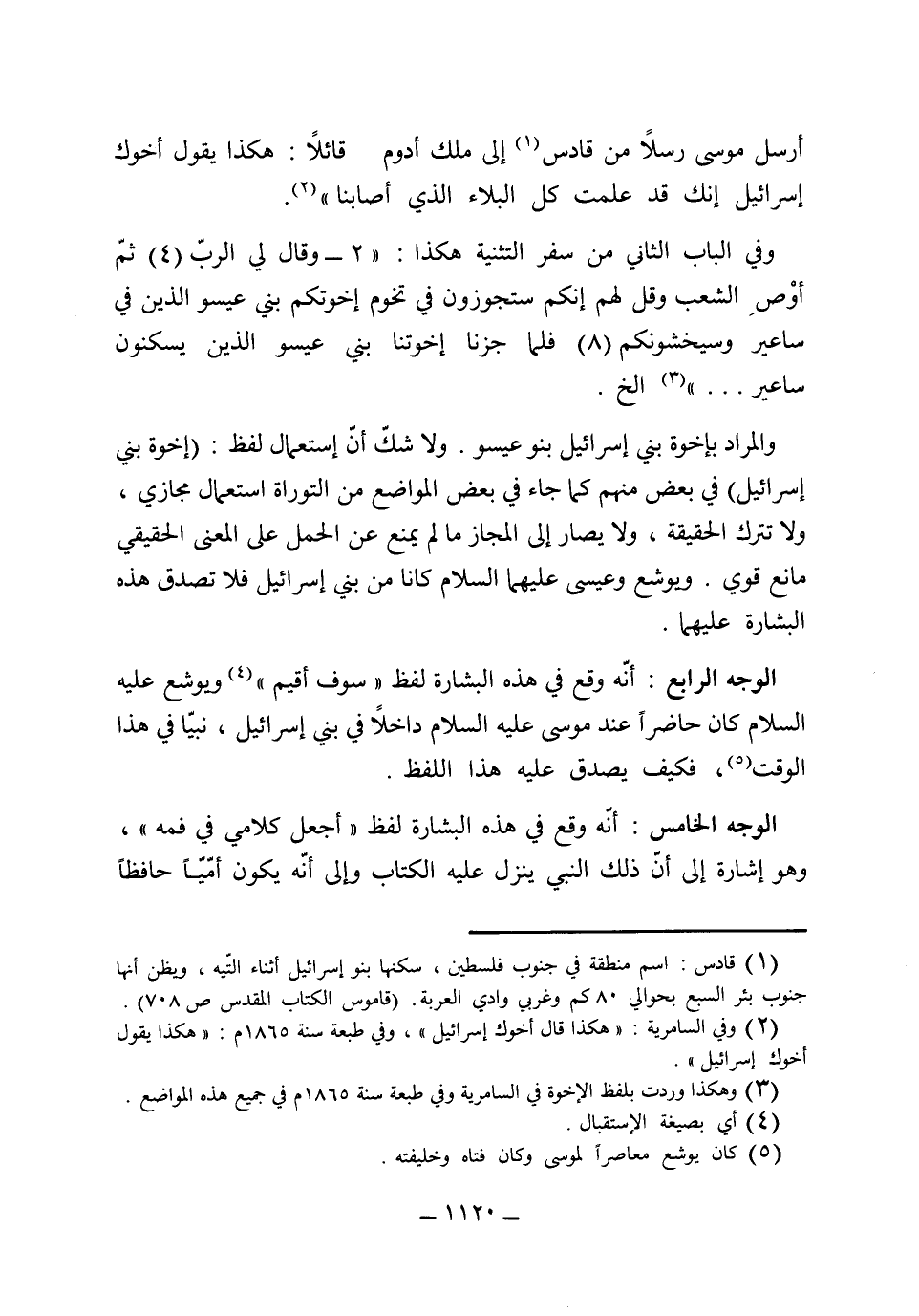 والمراد بأخوة بني إسرائيل بنو عيسو، ولا شك أن استعمال لفظ أخوة بني إسرائيل في بعض منهم كما جاء في بعض المواضع من التوراة، استعمال مجازي ولا تترك الحقيقة ولا يصار إلى المجاز ما لم يمنع عن الحمل على المعنى الحقيقي مانع قوي، ويوشع وعيسى عليهما السلام كانا من بني إسرائيل، فلا تصدق هذه البشارة عليهما.