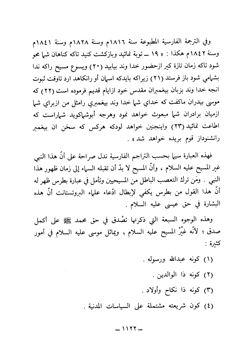 وفي الترجمة الفارسية المطبوعة سنة 1816، وسنة 1828، وسنة 1841، وسنة 1842، هكذا: 19 (تونيه نما يدوباز كشت كند تاكه كناهان شمامحو شودتا كه زمان تازه كيراز حضور خداوند بيابيد) 20 (ويسوع مسيح راكه ندا بشمامي شودباز فرستد) 21 (زيراكه بايد كه آسمان أورنكا هدارد تاوقت ثبوت انجه خداوندبزبان بيغمبران مقدس خودازايام قديم فرموده است) . 22 (كه موسى بيدران ما كفت كه خداى شماخداوند بيغمبري رامثل من ازبراى شما ازميان برادران شما مبعوث خواهد ثمود وهرجه أوبشما كويد شمار است كه أطاعت نماييد) 23 (واينجنين خواهد بودكه هركس كه سخن آن بيغمبر رانشنودازقوم بريده خواهدشد) . فهذه العبارة سيما بحسب التراجم الفارسية تدل صراحة على أن هذا النبي غير المسيح عليه السلام، وأن المسيح لا بد أن تقبله السماء إلى زمان ظهور هذا النبي.