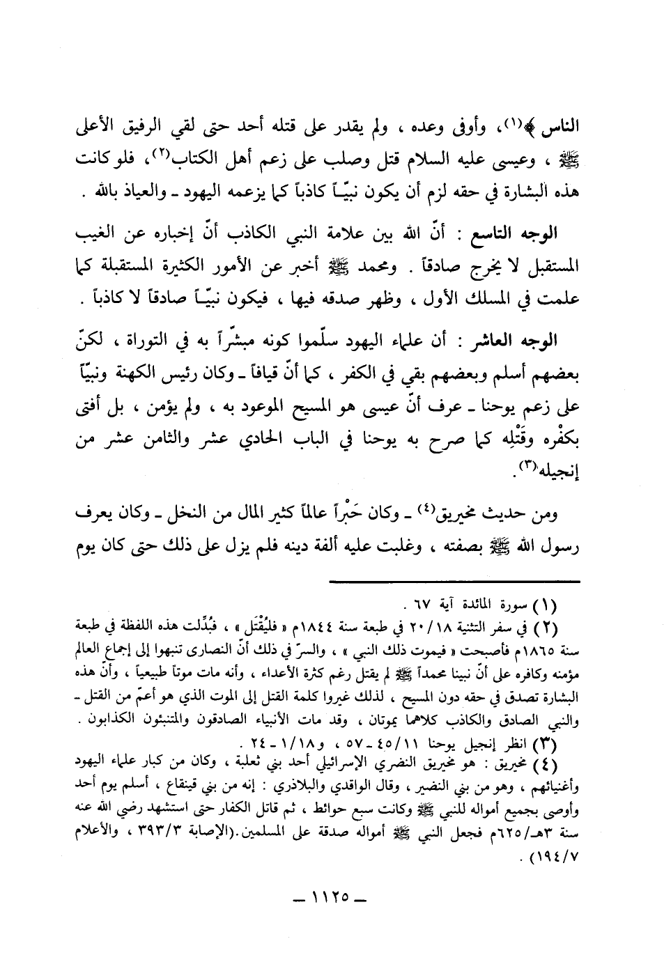 (الوجه العاشر) أن علماء اليهود سلموا كونه مبشراً به في التوراة لكن بعضهم أسلم وبعضهم بقي في الكفر، كما أن قيافا وكان رئيس الكهنة ونبياً على زعم يوحنا عرف أن عيسى هو المسيح الموعود به، ولم يؤمن بل أفتى بكفره وقتله، كما صرح به يوحنا في الباب الحادي عشر والثامن عشر من إنجيله من حديث مخيريق وكان حبراً عالماً كثير المال من النخل، وكان يعرف رسول الله صلى الله عليه وسلم بصفته، وغلبت عليه ألفة دينه فلم يزل على ذلك حتى كان يوم