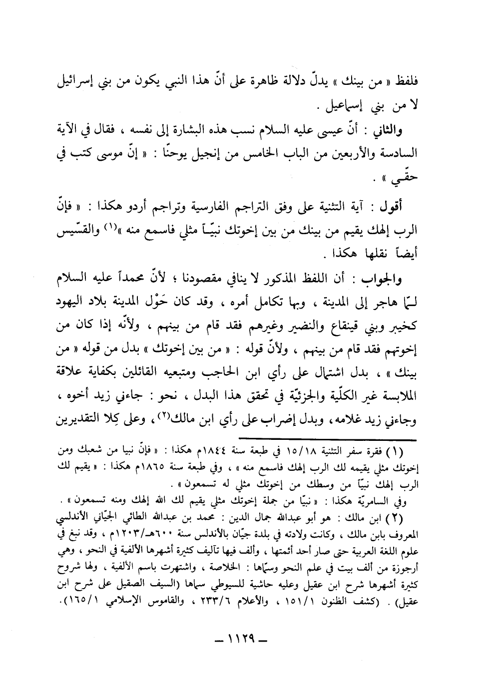 والثاني: أن عيسى عليه السلام نسب هذه البشارة إلى نفسه فقال في الآية السادسة والأربعين من الباب الخامس من إنجيل يوحنا أن موسى كتب في حقي أقول آية الاستثناء على وفق التراجم الفارسية وتراجم أردو هكذا: (فإن الرب إلهك يقيم من بينك من بين أخوتك نبياً مثلي فاسمع منه) والقسيس أيضاً نقلها هكذا (والجواب) أن اللفظ المذكور لا ينافي مقصودنا لأن محمداً عليه السلام لما هاجر إلى المدينة وبها تكامل أمره، وقد كان حول المدينة بلاد اليهود كخيبر وبني قينقاع والنضير وغيرهم، فقد قام من بينهم ولأنه إذا كان من أخوتهم فقد قام من بينهم، ولأن قوله من بين أخوتك بدل من قوله من بينك، بدل اشتمال على رأي ابن الحاجب ومتبعيه القائلين بكفاية علاقة الملابسة غير الكلية والجزئية في تحقيق هذا البدل، نحو جاءني زيد أخوه وجاءني زيد غلامه، وبدل إضراب على رأي ابن مالك، وعلى كلا التقديرين