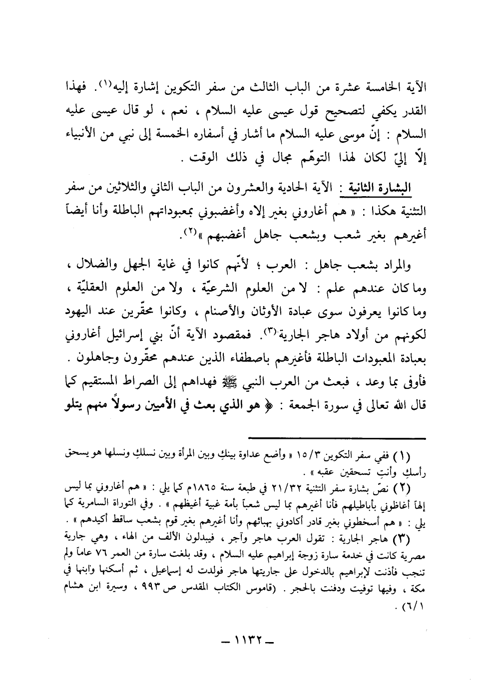 (البشارة الثانية) الآية الحادية والعشرون من الباب الثاني والثلاثين من سفر الاستثناء هكذا: (هم أغاروني بغير إله وأغضبوني بمعبوداتهم الباطلة وأنا أيضاً أغيرهم بغير شعب وبشعب جاهل أغضبهم) والمراد بشعب جاهل العرب لأنهم كانوا في غاية الجهل والضلال، وما كان عندهم علم لا من العلوم الشرعية ولا من العلوم العقلية، وما كانوا يعرفون سوى عبادة الأوثان والأصنام، وكانوا محقرين عند اليهود لكونهم من أولاد هاجر الجارية. فمقصود الآية أن بني إسرائيل أغاروني بعبادة المعبودات الباطلة فأغيرهم باصطفاء الذين هم عندهم محقرون وجاهلون، فأوفى بما وعد فبعث من العرب النبي صلى الله عليه وسلم فهداهم إلى الصراط المستقيم كما قال الله تعالى في سورة الجمعة: {هو الذي بعث في الأميين رسولاً منهم يتلو