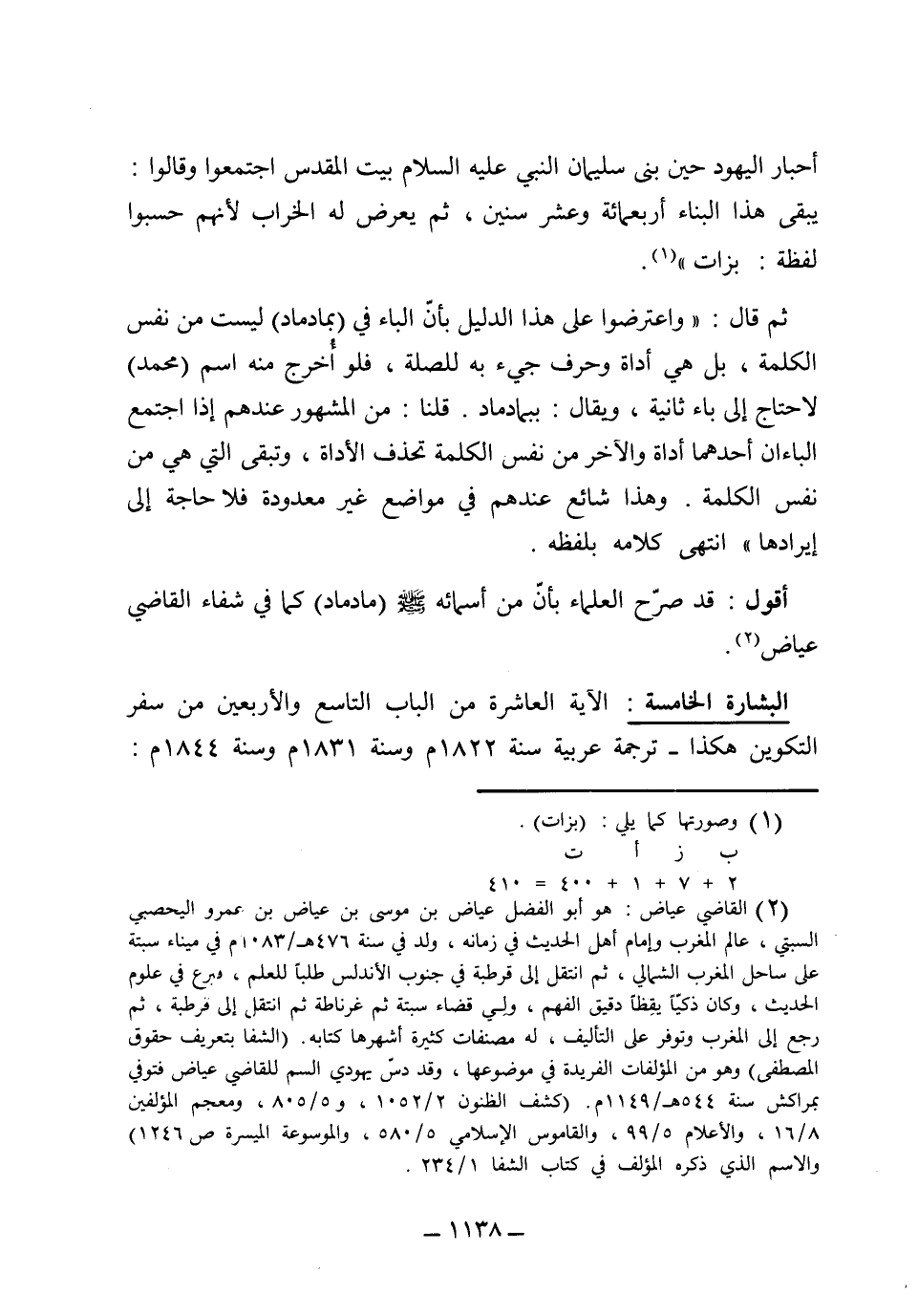 أحبار اليهود حين بنى سليمان النبي عليه السلام بيت المقدس، اجتمعوا وقالوا يبقى هذا البناء أربعمائة وعشرة سنين ثم يعرض له الخراب، لأنهم حسبوا لفظة بزات) ثم قال: (واعترضوا [ص 252] على هذا الدليل بأن الباء في بمادماد ليست من نفس الكلمة بل هي أداة وحرف جيء به للصلة فلو أخرج منه اسم محمد لاحتاج إلى باء ثانية ويقال ببمادماد، قلنا من المشهور عندهم إذا اجتمع الباآن أحدهما أداة والآخر من نفس الكلمة تحذف الأداة وتبقى التي هي من نفس الكلمة، وهذا شائع عندهم في مواضع غير معدودة فلا حاجة إلى إيرادها) انتهى كلامه بلفظه. أقول قد صرح العلماء بأن أسمائه صلى الله عليه وسلم مادماد كما في شفاء القاضي عياض.