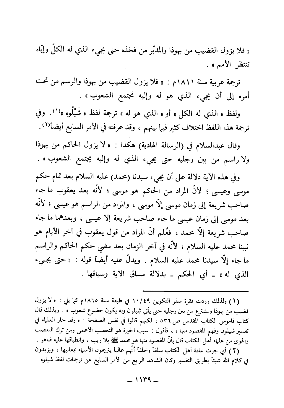 (فلا يزول القضيب من يهوذا والمدبر من فخذه حتى يجيء الذي له الكل وإياه تنتظر الأمم) وفي ترجمة عربية سنة 1811 (فلا يزول القضيب من يهوذا والرسم من تحت أمره إلى أن يجيء الذي هو له وإليه تجتمع الشعوب) . ولفظ الذي له الكل أو الذي هو له، ترجمة لفظ شيلوه، وفي ترجمة هذا اللفظ اختلاف كثير فيما بينهم وقد عرفت في الأمر السابع أيضاً، وقال عبد السلام في الرسالة الهادية هكذا: (لا يزول الحاكم من يهوذا ولا راسم من بين رجليه حتى يجيء الذي له وإليه تجتمع الشعوب) .