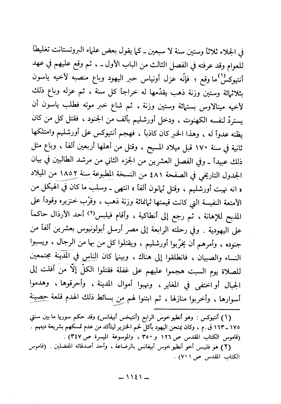 في الجلاء ثلاثاً وستين سنة لا سبعين كما يقول بعض علماء بروتستنت تغليطاً للعوام وقد عرفت في الفصل الثالث من الباب الأول، ثم وقع عليهم أنتيوكس ما وقع فإنه عزل أونياس حبر اليهود وباع منصبه لأخيه ياسون بثلثمائة وستين وزنة ذهب يقدمها له خراجاً كل سنة، ثم عزله وباع ذلك لأخيه مينالاوس بستمائة وستين وزنة، ثم شاع خبر موته فطلب ياسون أن يسترد لنفسه الكهنوت ودخل أورشليم بألوف من الجنود فقتل كل من كان يظنه عدواً له وهذا الخبر كان كاذباً فهجم أنتيوكس على أورشليم وامتلكها ثانية في سنة 170 قبل ميلاد المسيح وقتلمن أهلها أربعين ألفاً وباع مثل ذلك عبيداً، وفي الفصل العشرين من الجزء الثاني من مرشد الطالبين في بيان الجدول التاريخي في الصفحة 481 من النسخة المطبوعة سنة 1852 من الميلاد (أنه نهب أورشليم وقتل ثمانين ألفاً) انتهى. وسلب ما كان في الهيكل من الأمتعة النفيسة التي كانت قيمتها ثمانمائة وزنة ذهب وقرب خنزيرة وقوداً على المذبح للإهانة، ثم رجع إلى إنطاكية وأقام فيلبس أحد الأراذل حاكماً على اليهودية، وفي رحلته الرابعة إلى مصر أرسل أبولوينوس بعشرين ألفاً من جنوده وأمرهم أن يخربوا أورشليم ويقتلوا كل من بها من الرجال ويسبو النساء والصبيان فانطلقوا إلى هناك.