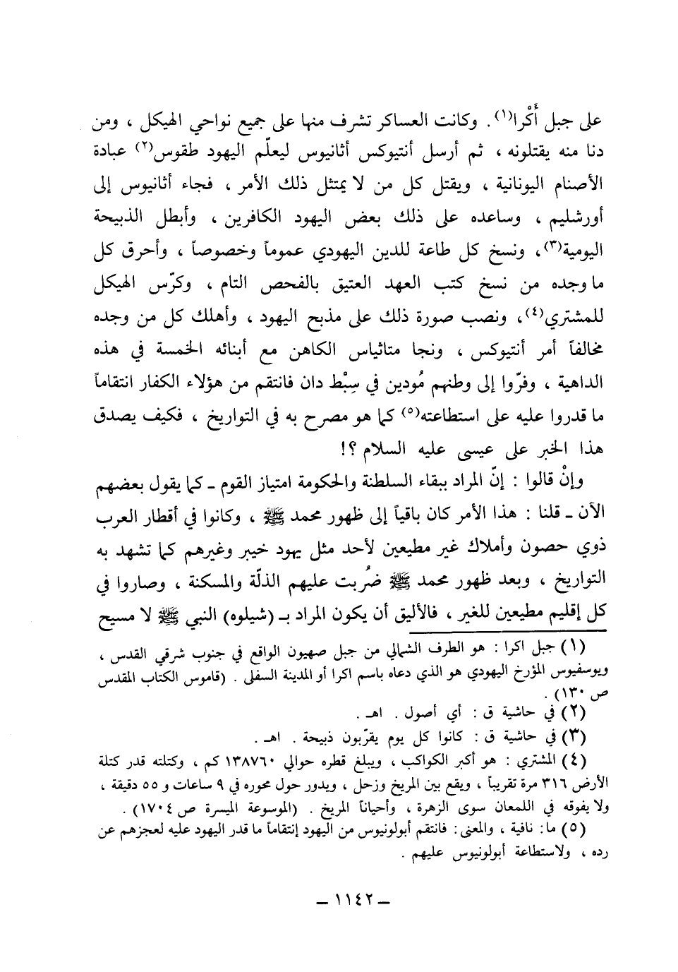 على جبل اكرا، وكانت العساكر تشرف منها على جميع نواحي الهيكل ومن دنا منه يقتلونه، ثم أرسل انتيوكس أثانيوس ليعلم اليهود طقوس عبادة الأصنام اليونانية ويقتل كل من لا يمتثل ذلك الأمر، فجاء أثانيوس إلى أورشليم وساعده على ذلك بعض اليهود الكافرين، وأبطل الذبيحة اليومية ونسخ كل طاعة للدين اليهودي عموماً وخصوصاً، وأحرق كل ما وجده من نسخ كتب العهد العتيق بالفحص التام، وكرس الهيكل للمشتري ونصب صورة ذلك على مذبح اليهود وأهلك كل من وجده مخالف أمر انتيوكس، ونجا متاثياس الكاهن مع أبنائه الخمسة في هذه الداهية وفروا إلى وطنهم مودين في سبط دان فانتقم من هؤلاء الكفار انتقاماً ما قدروا عليه على استطاعته كما هو مصرح به في التواريخ، فكيف يصدق هذا الخبر على عيسى عليه السلام وإن قالوا أن المراد ببقاء السلطنة والحكومة امتياز القوم كما يقول بعضهم الآن، قلنا هذا الأمر كان باقياً إلى ظهور محمد صلى الله عليه وسلم، وكانوا في أقطار العرب ذوي حصون وأملاك غير مطيعين لأحد مثل يهود خيبر وغيرهم كما يشهد به التواريخ، وبعد ظهور محمد صلى الله عليه وسلم ضربت عليهم الذلة والمسكنة وصاروا في كل إقليم مطيعين للغير، فالأليق أن يكون المراد بشيلوه النبي صلى الله عليه وسلم لا مسيح