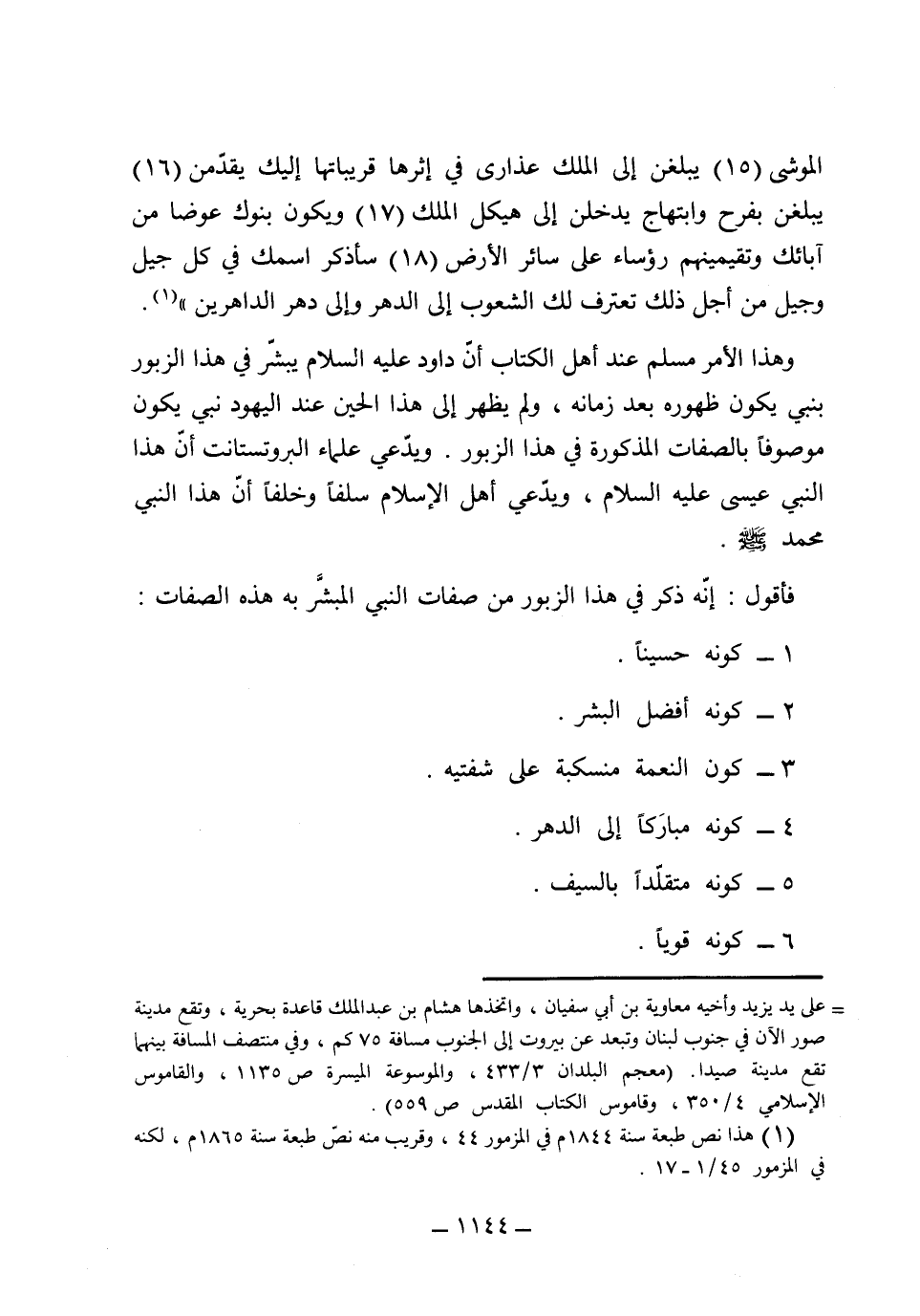 وهذا الأمر مسلم عند أهل الكتاب أن داود عليه السلام يبشر في هذا الزبور بنبي يكون ظهوره بعد زمانه، ولم يظهر إلى هذا الحين عند اليهود نبي يكون موصوفاً بالصفات المذكورة في هذا الزبور، ويدعى علماء بروتستنت أن هذا النبي عيسى عليه السلام، ويدعي أهل الإسلام سلفاً وخلفاً أن هذا النبي محمد صلى الله عليه وسلم. فأقول أنه ذكر في هذا الزبور من صفات النبي المبشر به هذه الصفات: