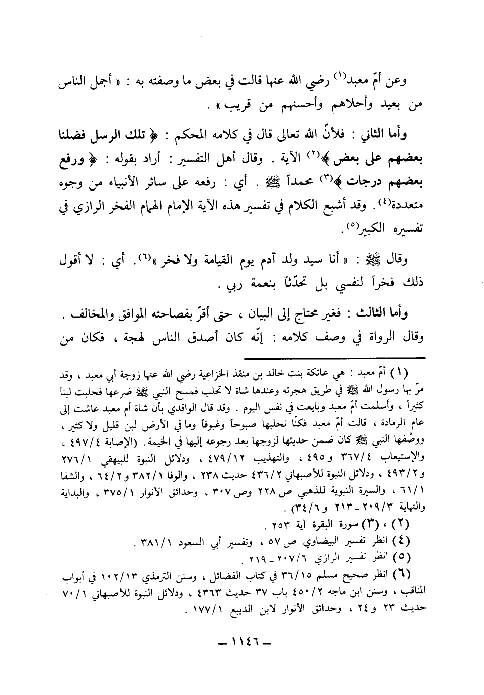 وأما الثاني: فلأن الله تعالى قال في كلامه المحكم: {تلك الرسل فضلنا بعضهم على بعض) الآية. وقال أهل التفسير أراد بقوله {ورفع بعضهم درجات} محمداً صلى الله عليه وسلم أي رفعه على سائر الأنبياء من وجوه متعددة، وقد أشبع الكلام في تفسير هذه الآية الإمام الهمام الفخر الرازي في تفسيره الكبير. وقال صلى الله عليه وسلم: (أنا سيد ولد آدم يوم القيامة ولا فخر) أي لا أقول ذلك فخراً لنفسي بل تحدثاً بنعمة ربي.