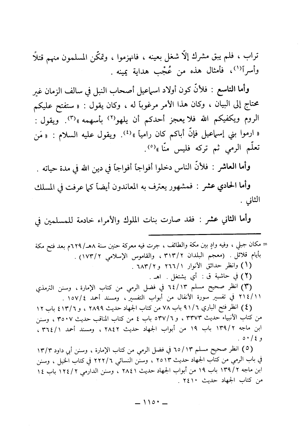 وأما التاسع: فلأن كون أولاد إسماعيل أصحاب النبل في سالف الزمان، غير محتاج إلى البيان وكان هذا الأمر مرغوباً له وكان يقول: (ستفتح عليكم الروم ويكفيكم الله فلا يعجز أحدكم أن يلهو بأسهمه) . ويقول: (ارموا بني إسماعيل فإن أباكم كان رامياً) . ويقول عليه السلام: (من تعلم الرمي ثم تركه فليس منا) .