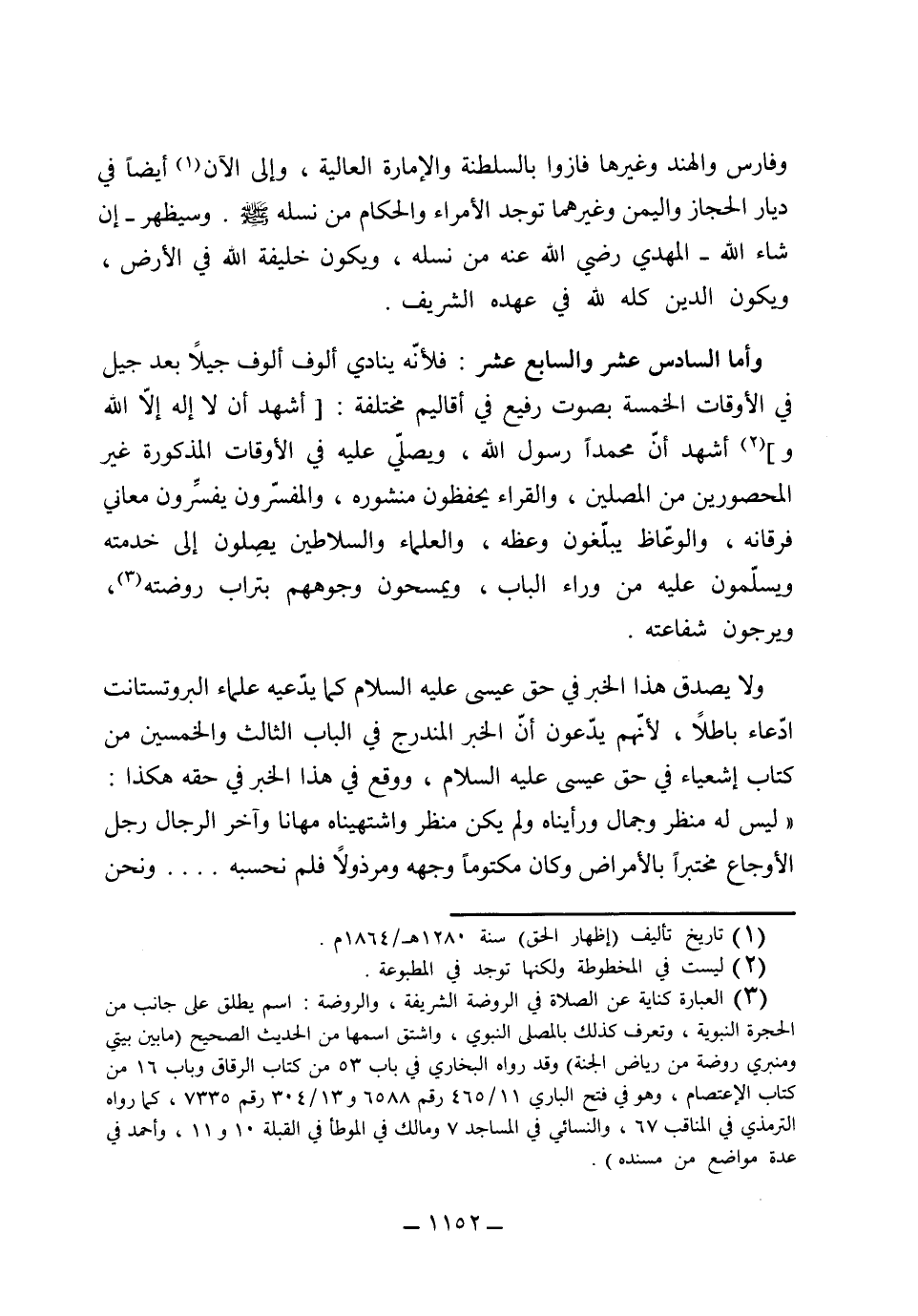 وأما السادس عشر والسابع عشر: فلأنه ينادي ألوف ألوف جيلاً بعد جيل في الأوقات الخمسة، بصوت رفيع في أقاليم مختلفة: (أشهد أن لا إله إلا الله وأشهد أن محمداً رسول الله) . ويصلي عليه في الأوقات المذكورة الغير المحصورين من المصلين، والقراء يحفظون منشوره، والمفسرين يفسرون معاني فرقانه، والوعاظ يبلغون وعظه، والعلماء والسلاطين يصلون إلى خدمته، ويسلمون عليه من وراء الباب، ويمسحون وجوههم بتراب روضته ويرجون شفاعته.