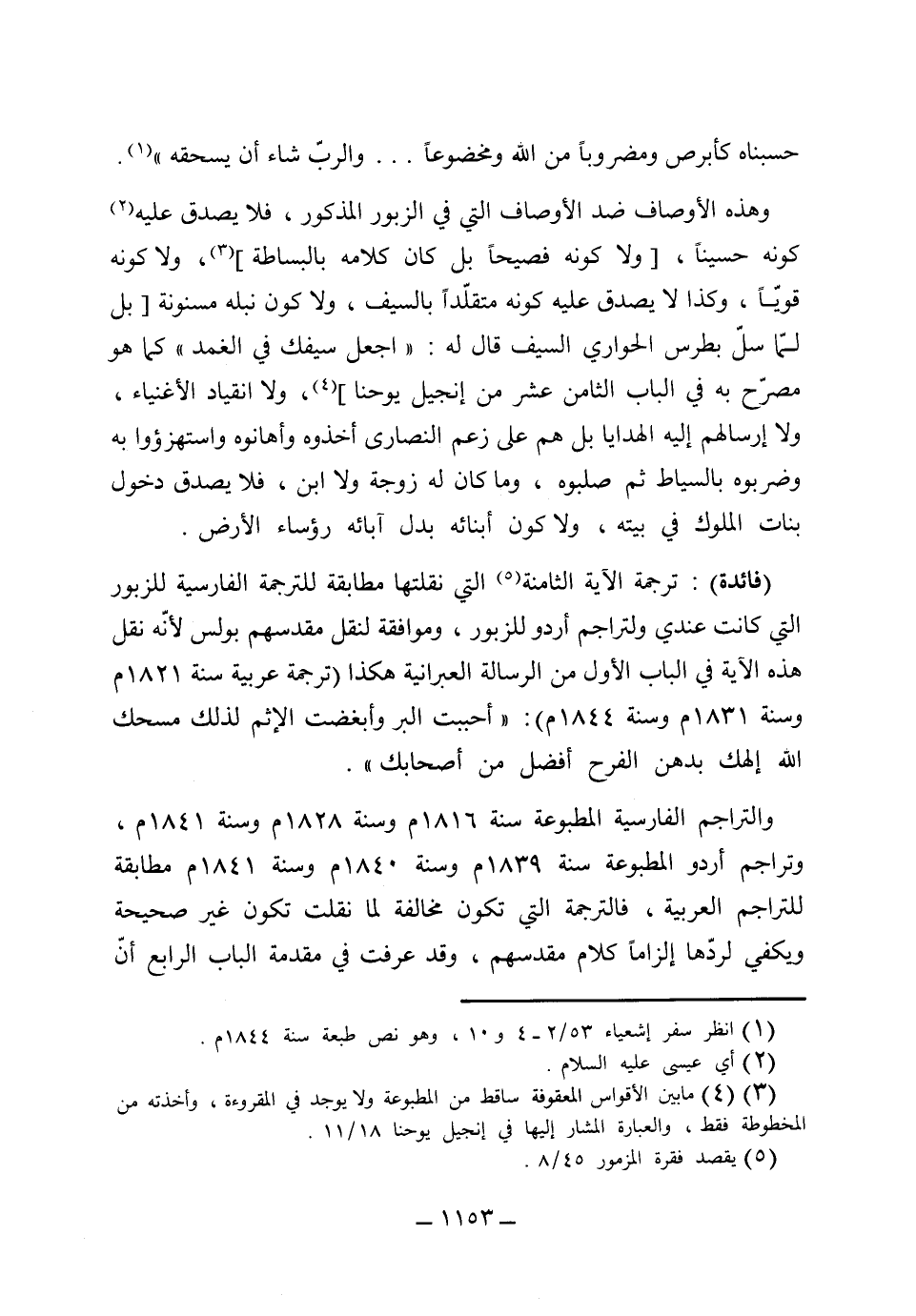 (فائدة) ترجمة الآية الثامنة التي نقلتها مطابقة للترجمة الفارسية للزبور كانت عندي، ولتراجم أردو للزبور، وموافقة لنقل مقدسهم بولس، لأنه نقل هذه الآية في الباب الأول من رسالته العبرانية. هكذا ترجمة عربية سنة 1821، وسنة 1831، وسنة 1844: (أحببت البر وأبغضت الإثم، لذلك مسحك الله إلهك بدهن الفرح أفضل من أصحابك) . والتراجم الفارسية المطبوعة سنة 1816، وسنة 1828، وسنة 1841. وتراجم أردو المطبوعة سنة 1839، وسنة 1840، وسنة 1841. مطابقة للتراجم العربية. فالترجمة التي تكون مخالفة لما نقلت تكون غير صحيحة. ويكفي لردها إلزاماً كلام مقدسهم. وقد عرفت في مقدمة الباب الرابع أن