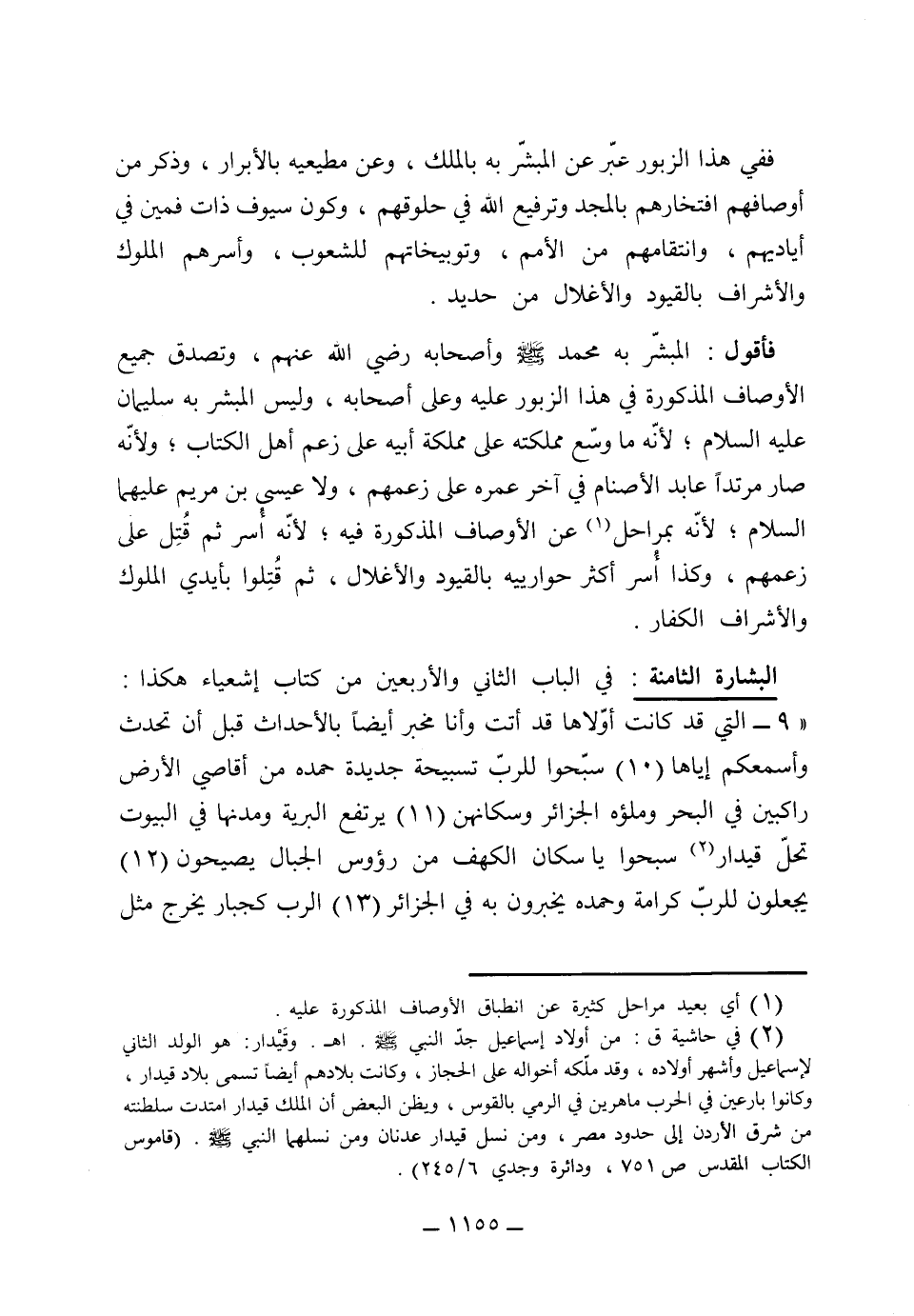 ففي هذا الزبور عبر عن المبشر به بالملك وعن مطيعه بالأبرار، وذكر من أوصافهم افتخارهم بالمجد وترفيع الله في حلوقهم، وكون سيوف ذات فمين في أياديهم، وانتقامهم من الأمم وتوبيخاتهم للشعوب، وأسرهم الملوك والأشراف بالقيود والأغلال من حديد. فأقول المبشر به محمد صلى الله عليه وسلم وأصحابه رضي الله عنهم ويصدق جميع الأوصاف المذكورة في هذا الزبور عليه وعلى أصحابه، وليس المبشر به سليمان عليه السلام لأنه ما وسع مملكته على مملكة أبيه على زعم أهل الكتاب، ولأنه صار مرتداً عابداً الأصنام في آخر عمره على زعمهم، ولا عيسى ابن مريم عليهما السلام لأنه بمراحل عن الأوصاف المذكورة فيه لأنه أسر ثم قتل على زعمهم، وكذا أسر أكثر حواريه بالقيود والأغلال، ثم قتلوا بأيدي الملوك والأشراف الكفار.