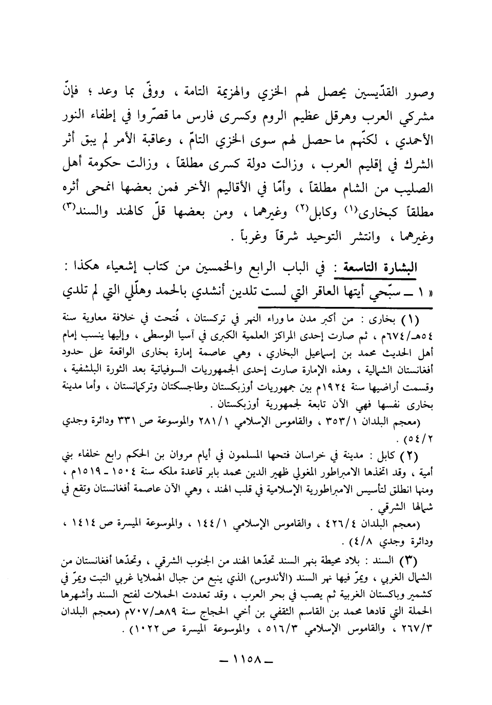 وأما في الأقاليم الأخر، فمن بعضها انمحى أثره مطلقاً كبخارى وكابل وغيرهما، ومن بعضها قل كالهند والسند وغيرهما وانتشر التوحيد شرقاً وغرباً.
