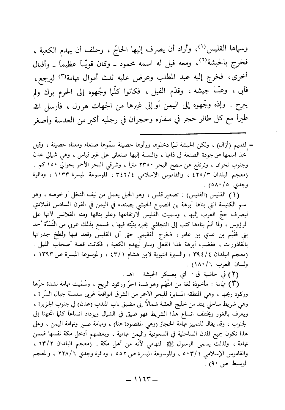 وسماها القليس وأراد أن يصرف إليها الحاج وحلف أن يهدم الكعبة، فخرج بالحبشة ومعه فيل له اسمه محمود وكان قوياً عظيماً وأفيال أخرى، فخرج إليه عبد المطلب وعرض عليه ثلث أموال تهامة ليرجع فأبى، وعبأ جيشه، وقدم الفيل فكانوا كلما وجهوه إلى الحرم برك ولم يبرح وإذا وجهوه إلى اليمن أو إلى غيره من الجهات هرول، فأرسل الله طيراً مع كل طائر حجر في منقاره وحجران في رجليه أكبر من العدسة وأصغر