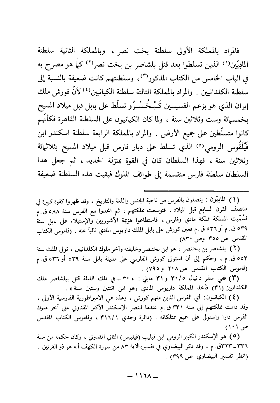 فالمراد بالمملكة الأولى سلطنة بختنصر، وبالمملكة الثانية سلطنة المادئين الذين تسلطوا بعد قتل بلشاصر بن بختنصر كما هو مصرح به في الباب الخامس من الكتاب المذكور، وسلطنتهم كانت ضعيفة بالنسبة إلى سلطنة الكلدانيين، والمراد بالمملكة الثالثة سلطنة الكيانيين لأن قورش ملك إيران الذي هو بزعم القسيسين كيخسر وتسلط على بابل قبل ميلاد المسيح بخمسمائة وست وثلاثين سنة، ولما كان الكيانيون على السلطنة القاهرة فكأنهم كانوا متسلطين على جميع الأرض والمراد بالمملكة الرابعة سلطنة اسكندر بن فيلفوس الرومي الذي تسلط على ديار فارس قبل ميلاد المسيح بثلثمائة وثلاثين سنة، فهذا السلطان كان في القوة بمنزلة الحديد ثم جعل هذا السلطان سلطنة فارس منقسمة على طوائف الملوك فبقيت هذه السلطنة ضعيفة