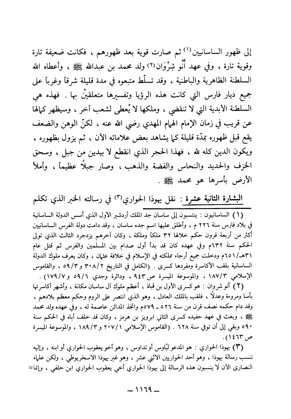 إلى ظهور الساسانيين ثم صارت قوية بعد ظهورهم فكانت ضعيفة تارة وقوية تارة وتولد في عهد نوشيروان (محمد بن عبد الله) صلى الله عليه وسلم وأعطاه الله السلطنة الظاهرية والباطنية وقد تسلط متبعوه في مدة قليلة شرقاً وغرباً وعلى جميع ديار فارس التي كانت هذه الرؤيا وتفسيرها متعلقين بها، فهذه هي السلطنة الأبدية التي لا تنقضي وملكها لا يعطى لشعب آخر وسيظهر كمالها عن قريب في زمان الإمام المهدي رضي الله عنه لكن الوهن والضعف يقع قبل ظهوره بمدة قليلة كما يشاهد بعض علاماته الآن ثم يزول بظهوره ويكون الدين كله لله، فهذا الحجر الذي انقطع لا بيدين من جبل وسحق الخزف والحديد والنحاس والفضة والذهب وصار جبلاً عظيماً وملأ الأرض بأسرها هو محمد صلى الله عليه وسلم.