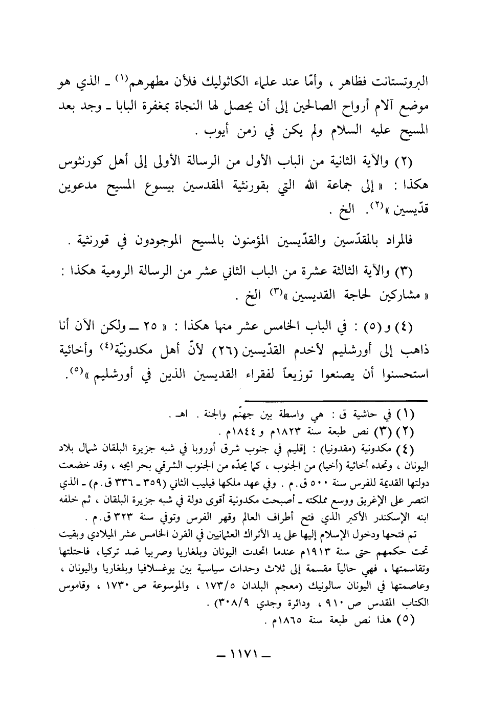 [2] والآية الثانية من الباب الأول من الرسالة الأولى إلى أهل قورنيثوس هكذا: (إلى جماعة الله التي بقورنثية المقدسين بيسوع المسيح المدعوين قديسين) الخ. فالمراد بالمقدسين والقديسين المؤمنون بالمسيح الموجودون في قورنثية.