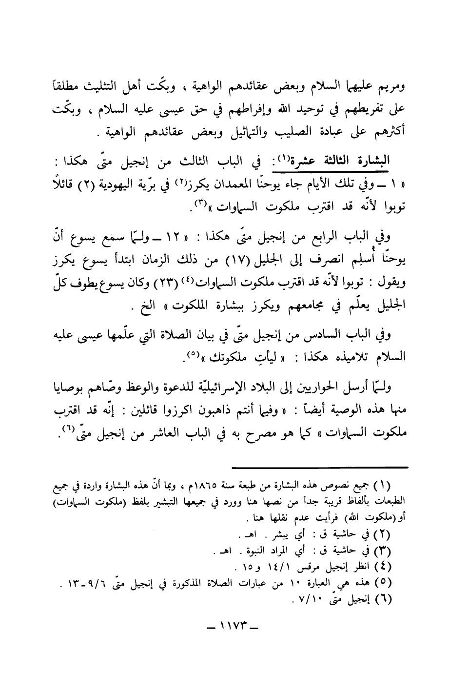 (البشارة الثالثة عشر) في الباب الثالث من إنجيل متى هكذا: (وفي تلك الأيام جاء يوحنا المعمدان يكرز في برية اليهودية) 2 (قائلاً توبوا لأنه قد اقترب ملكوت السماوات) . وفي الباب الرابع من إنجيل متى هكذا: 12 (ولما سمع يسوع أن يوحنا أسلم انصرف إلى الجليل) 17 (من ذلك الزمان ابتدأ يسوع يكرز ويقول توبوا لأنه قد اقترب ملكوت السماوات) 23 (وكان يسوع يطوف كل الجليل ويعلم في مجامعهم ويكرز ببشارة الملكوت الخ) . وفي الباب السادس من إنجيل متى في بيان الصلاة التي علمها عيسى عليه السلام تلاميذه هكذا: (ليأت ملكوتك) ولما أرسل الحواريين إلى البلاد الإسرائيلية للدعوة والوعظ، وصاهم بوصايا منها هذه الوصية أيضاً: (وفيما أنتم ذاهبون اكرزوا قائلين أنه قد اقترب ملكوت السماوات) كما هو مصرح به في الباب العاشر من إنجيل متى