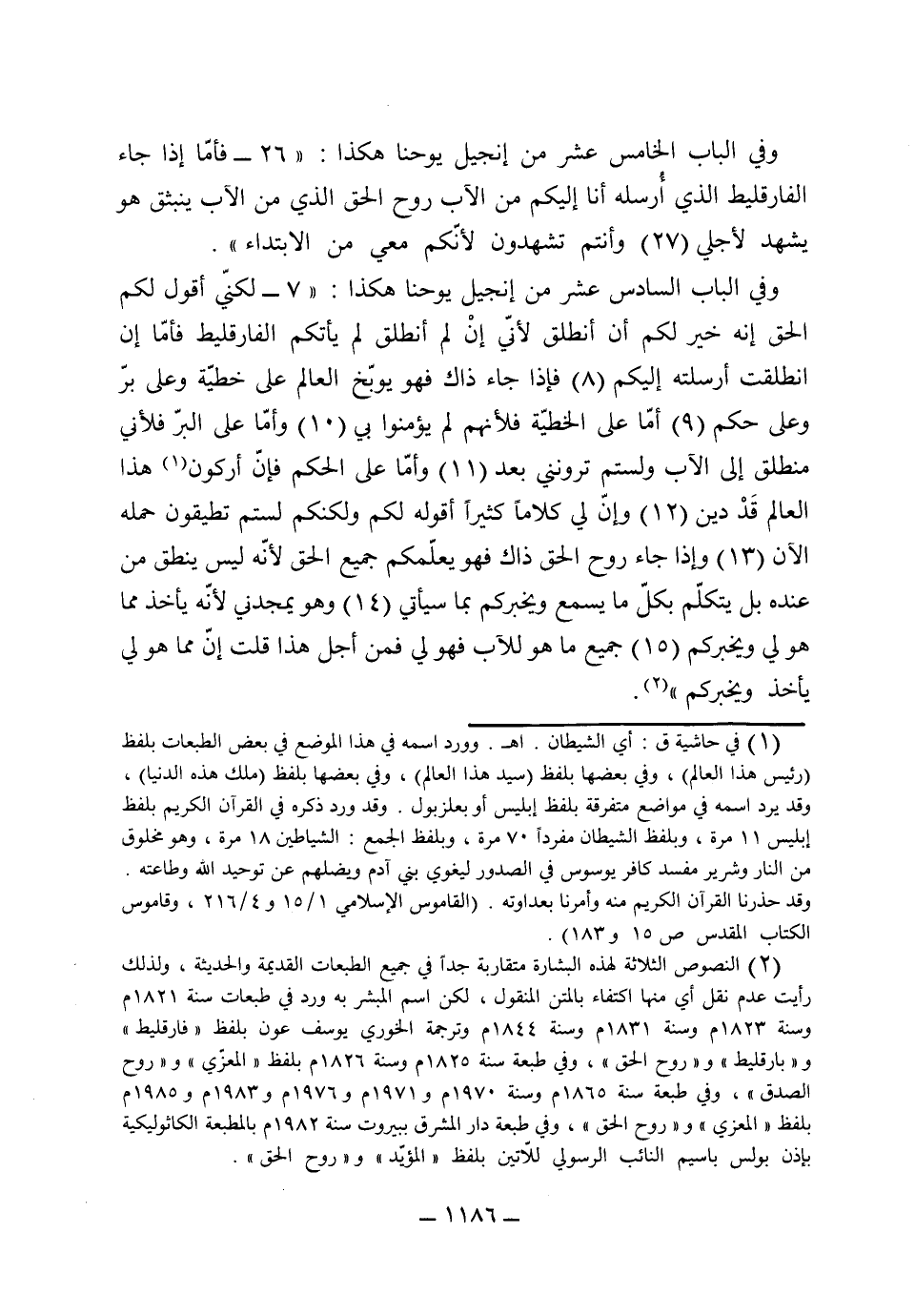وفي الباب الخامس عشر من إنجيل يوحنا هكذا: (فأما إذا جاء الفارقليط الذي أرسله أنا إليكم من الأب روح الحق الذي من الأب ينبثق هو يشهد لأجلي) 27 (وأنتم تشهدون لأنكم معي من الابتداء) . وفي الباب السادس عشر من إنجيل يوحنا هكذا: 7 (لكني أقول لكم الحق أنه خير لكم أن انطلق لأني إن لم أنطلق لم يأتكم الفارقليط فأما إن انطلقت أرسلته إليكم) 8 (فإذا جاء ذاك فهو يوبخ العالم على خطية وعلى بر وعلى حكم) 9 (أما على الخطية فلأنهم لم يؤمنوا بي) 10 (وأما على البر فلأني منطلق إلى الأب ولستم ترونني بعد) 11 (وأما على الحكم فإن أركون هذا العالم قد دين) 12 (وأن لي كلاماً كثيراً أقوله لكم ولكنكم لستم تطيقون حمله الآن) 13 (وإذا جاء روح الحق ذاك فهو يعلمكم جميع الحق لأنه ليس ينطق من عنده بل يتكلم بكل ما يسمع ويخبركم بما سيأتي) 14 (وهو يمجدني لأنه يأخذ مما هو لي ويخبركم) 15 (جميع ما هو الأب فهو لي فمن أجل هذا قلت أن مما هو لي يأخذ ويخبركم) .