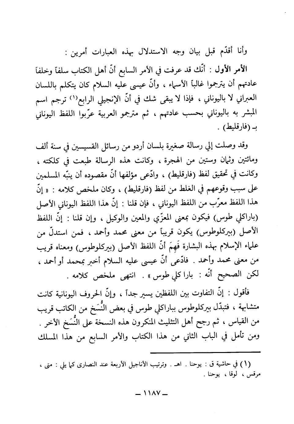 الأمر الأول: أنك قد عرفت في الأمر السابع، أن أهل الكتاب سلفاً وخلفاً عادتهم أن يترجموا غالباً الأسماء، وأن عيسى عليه السلام كان يتكلم باللسان العبراني لا باليوناني، فإذاً لا يبقى شك في أن الإنجيلي الرابع ترجم اسم المبشر به باليوناني بحسب عادتهم، ثم مترجمو العربية عربوا اللفظ اليوناني بفارقليط، وقد وصلت إلى رسالة صغيرة في لسان أردو من رسائل القسيسين في سنة ألف ومائتين وثمان وستين من الهجرة، وكانت هذه الرسالة طبعت في كلكته وكانت في تحقيق لفظ فارقليط، وادعى مؤلفها أن مقصوده أن ينبه المسلمين على سبب وقوعهم في الغلط من لفظ فارقليط، وكان ملخص كلامه: (أن هذا اللفظ معرب من اللفظ اليوناني فإن قلنا أن هذا اللفظ اليوناني الأصل باراكلي طوس فيكون بمعنى المعزي والمعين والوكيل، وإن قلنا أن اللفظ الأصل بيركلو طوس يكون قريباً من معنى محمد وأحمد، فمن استدل من علماء الإسلام بهذه البشارة فهم أن اللفظ الأصل بيركلو طوس ومعناه قريب من معنى محمد وأحمد، فادعى أن عيسى عليه السلام أخبر بمحمد أو أحمد لكن الصحيح أنه باراكلي طوس) انتهى ملخصاً من كلامه.
