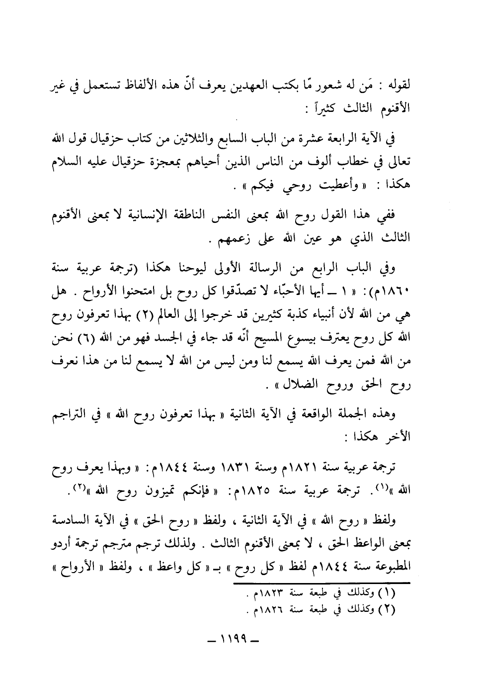 لقوله من له شعور ما بكتب العهدين، يعرف أن هذه الألفاظ تستعمل في غير الأقنوم كثيراً، في الآية الرابعة عشر من الباب السابع والثلاثين من كتاب حزقيال قول الله تعالى في خطاب ألوف من الناس الذين أحياهم بمعجزة حزقيال عليه السلام هكذا: (فأعطى فيكم روحي) .