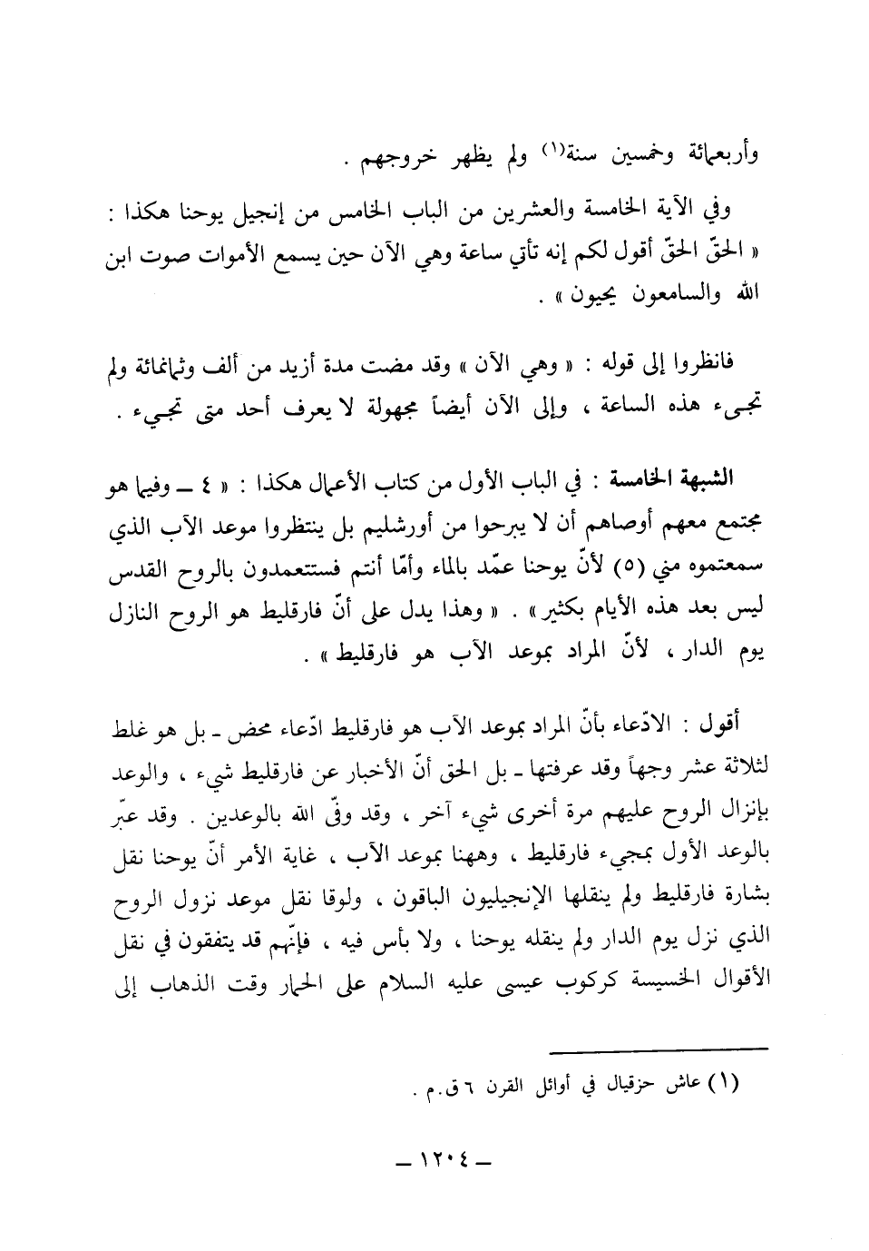 وفي الآية الخامسة والعشرين من الباب الخامس من إنجيل يوحنا هكذا: (الحق الحق أقول لكم أنه تأتي ساعة وهي الآن حين يسمع الأموات صوت ابن الله والسامعون يحيون) فانظروا إلى قوله وهي الآن وقد مضت مدة أزيد من ألف وثمانمائة ولم تجيء هذه الساعة والى الآن أيضاً مجهولة لا يعرف أحد متى تجيء.
