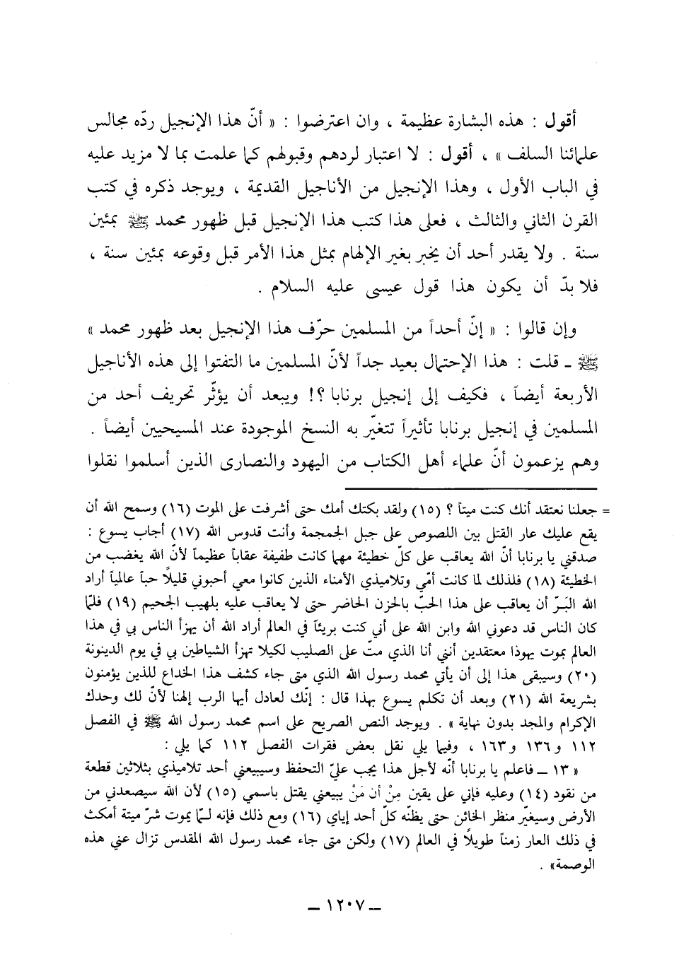 (أقول) هذه البشارة عظيمة وإن اعترضوا أن هذا الإنجيل رده مجالس علمائنا السلف (أقول) لا اعتبار لردهم وقبولهم كما علمت بما لا مزيد عليه في الباب الأول، وهذا الإنجيل من الأناجيل القديمة ويوجد ذكره في كتب القرن الثاني والثالث، فعلى هذا كتب هذا الإنجيل قبل ظهور محمد صلى الله عليه وسلم بمئتين سنة، ولا يقدر أحد أن يخبر بغير الإلهام بمثل هذا الأمر قبل وقوعه بمئتين سنة، فلا بد أن يكون هذا قول عيسى عليه السلام، وإن قالوا أن أحداً من المسلمين حرف هذا الإنجيل بعد ظهور محمد صلى الله عليه وسلم، قلت: هذا الاحتمال بعيد جداً لأن المسلمين ما التفتوا إلى هذه الأناجيل الأربعة أيضاً، فكيف إلى إنجيل برنابا، ويبعد أن يؤثر تحريف أحد من المسلمين في إنجيل برنابا تأثيراً يتغير به النسخ الموجودة عند المسيحيين أيضاً، وهم يزعمون أن علماء أهل الكتاب من اليهود والنصارى الذين أسلموا، نقلوا