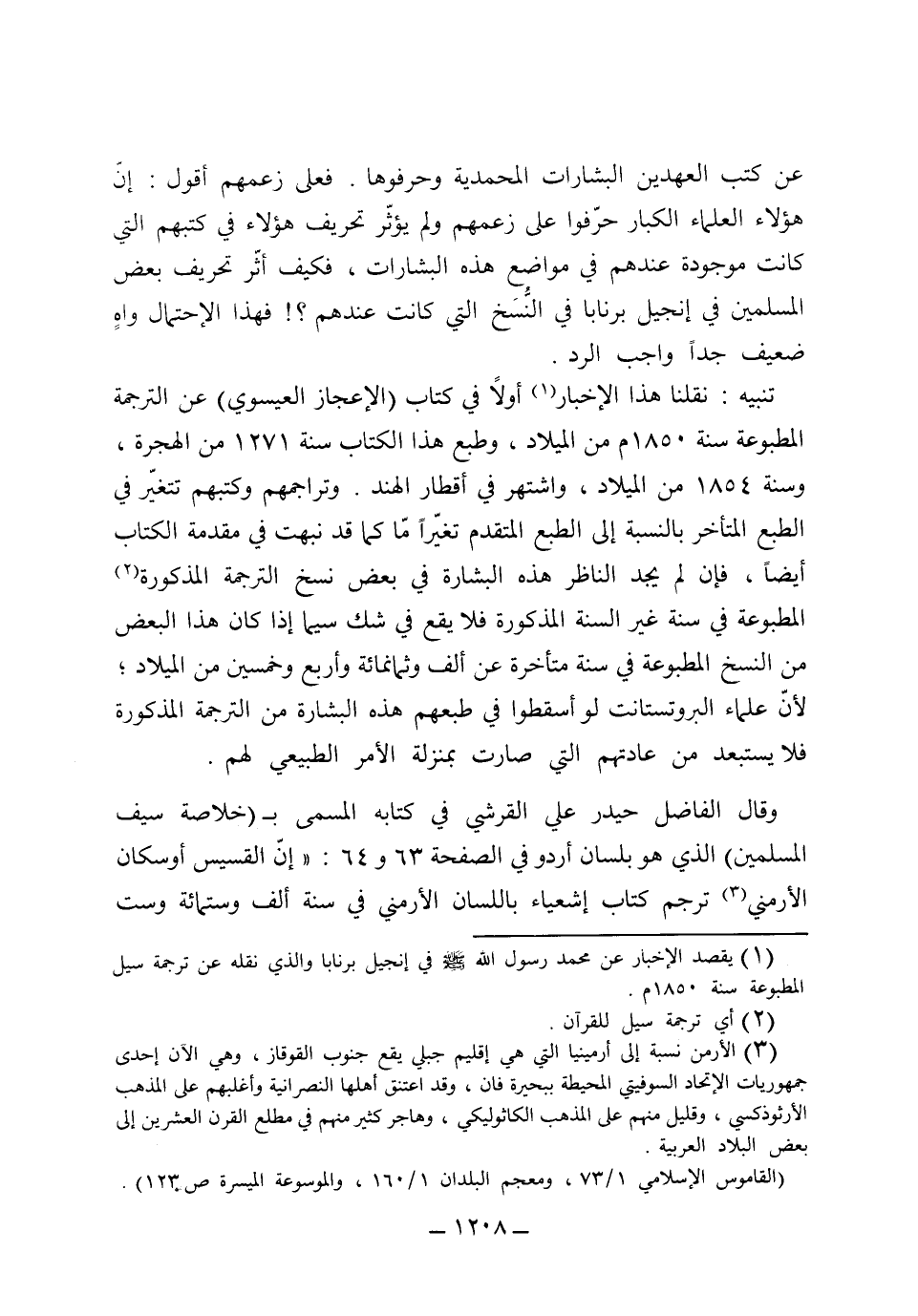 (تنبيه) نقلنا هذا الإخبار أولاً في الكتاب الإعجاز العيسوي، عن الترجمة المطبوعة سنة 1850 من الميلاد، وطبع هذا الكتاب سنة 1271 من الهجرة وسنة 1854 من الميلاد واشتهر في أقطار الهند وتراجمهم، وكتبهم تتغير في الطبع المتأخر بالنسبة إلى الطبع المتقدم تغيراً ما، كما قد نبهت في مقدمة الكتاب أيضاً، فإن لم يجد الناظر هذه البشارة في بعض نسخ الترجمة المذكورة المطبوعة في سنة غير السنة المذكورة لا يقع في شك سيما إذا كان هذا البعض من النسخ المطبوعة في سنة متأخرة عن ألف وثمانمائة وأربع وخمسين من الميلاد، لأن علماء بروتستنت لو أسقطوا في طبعهم هذه البشارة من الترجمة المذكورة فلا يستبعد من عادتهم التي صارت، بمنزلة الأمر الطبيعي لهم.