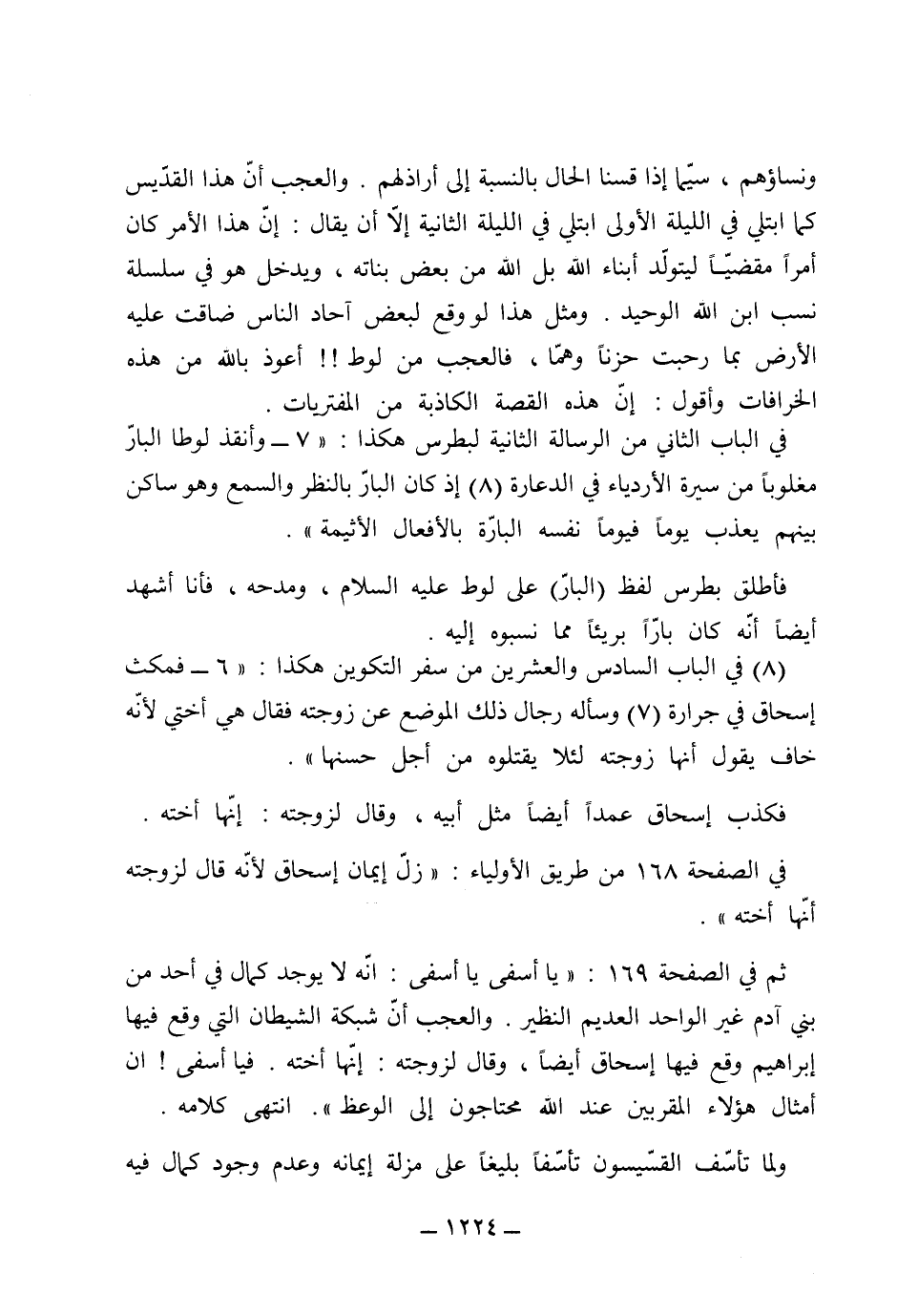 والعجب أن هذا القديس كما ابتلي في الليلة الأولى، ابتلي في الليلة الثانية، إلا أن يقال إن هذا الأمر كان أمراً مقضياً ليتولد أبناء الله، بل الله من بعض بناته ويدخل هو في سلسلة نسب ابن الله الوحيد، ومثل هذا لو وقع لبعض آحاد الناس ضاقت عليه الأرض بما رحبت حزناً وهماً، فالعجب من لوط. أعوذ بالله من هذه الخرافات، وأقول إن هذه القصة الكاذبة من المفتريات: في الباب الثاني من الرسالة الثانية لبطرس هكذا: 7 (وأنقذ لوطاً البار مغلوباً من سيرة الأردياء في الدعارة) 8 (إذا كان البار بالنظر والسمع وهو الساكن بينهم يعذب يوماً فيوماً نفسه البارة بالأفعال الأثيمة) . فأطلق بطرس البار على لوط عليه السلام ومدحه، فأنا أشهد أيضاً أنه كان باراً برياً مما نسبوه إليه.