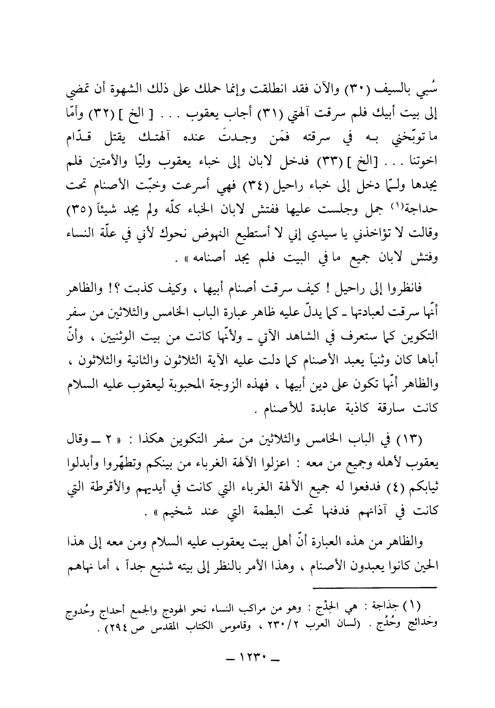 سبي بالسيف) 30 (والآن قد انطلقت، وإنما حملك على ذلك الشهوة أن تمضي إلى بيت أبيك فلم سرقت آلهتي) 31 (أجاب يعقوب الخ) 32 (وأما ما توبخني به في سرقته فمن وجدت عنده آلهتك يقتل قدام أخوتنا الخ) 33 (فدخل لابان إلى خباء يعقوب وليا والأمتين فلم يجدها، ولما دخل إلى خباء راحيل) 34 (فهي أسرعت، وخبت الأصنام تحت حداجة جمل، وجلست عليه، ففتش لابان الخباء كله، ولم يجد شيئاً) 35 (وقالت لا تؤاخذني يا سيدي إني لا أستطيع النهوض نحوك لأني في علة النساء، وفتش لابان جميع ما في البيت فلم يجد) .