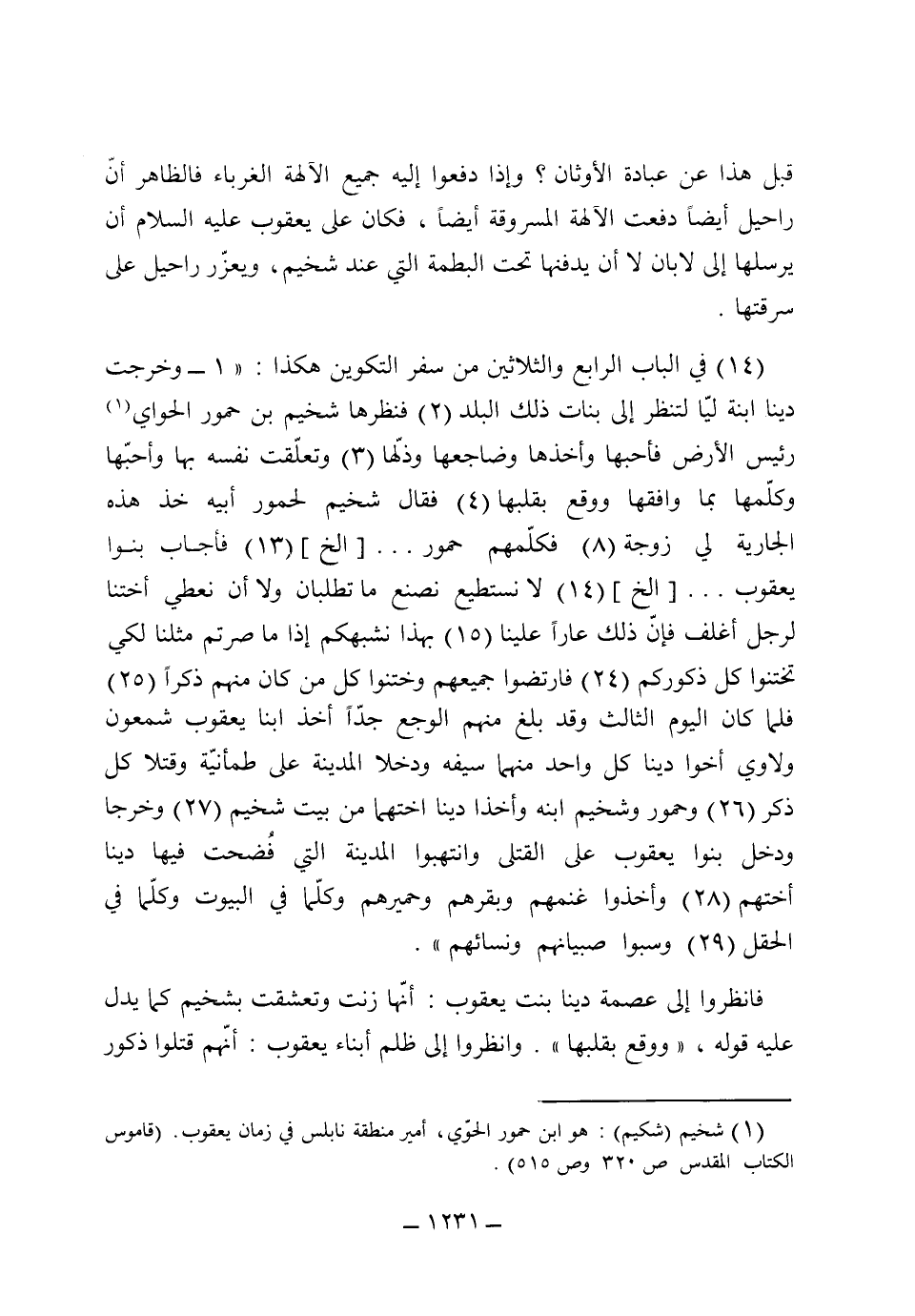 [14] في الباب الرابع والثلاثين من سفر التكوين هكذا: 1 (وخرجت دينا ابنة ليا لتنظر إلى بنات ذلك البلد) 2 (فنظرها شخيم بن حمور الحاوي، رئيس الأرض فأحبها فأخذها وضاجعها وذلها) 3 (وتعلقت نفسه بها، وأحبها وكلمها بما وافقها، ووقع بقلبها) 4 (فقال شخيم لحمور أبيه خذ هذه الجارية لي زوجة) 8 (فكلمهم حمور) الخ 13 (فأجاب بنو يعقوب الخ) 14 (لا نستطيع نصنع ما تطلبان، ولا أن نعطي أختنا لرجل أغلف فإن ذلك عار علينا) 15 (بهذا نشبهكم إذا ما صرتم مثلنا لكي تختنوا كل ذكوركم) 24 (فارتضى جميعهم واختتن كل من كان منهم ذكراً) 25 (فلما كان اليوم الثالث وقد بلغ منهم الوجع جداً، أخذ ابنا يعقوب شمعون ولاوى أخوا دينا، كل واحد منهما سيفه، ودخلا المدينة على طمأنينة، وقتلا كل ذكر) 26 (وحمور، وشخيم ابنه، وأخذا دينا [ص 312] أختهما من بيت شخيم) 27 (وخرجا ودخل بنو يعقوب على القتلى، ونهبوا المدينة التي فضحت فيها دينا أختهم) 28 (وأخذوا غنمهم، وبقرهم، وحميرهم، وكل ما في البيوت، وكل ما في الحقل وسبوا صبيانهم، ونساءهم) .